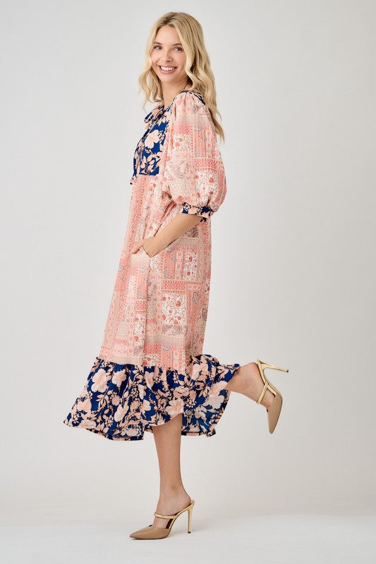The relaxed silhouette and 3/4 puff sleeves offer ease and elegance, while thoughtful details like a soft neckline tie, subtle ruffle hem, and hidden side pockets make it as practical as it is pretty. Perfect for spring brunches, casual gatherings, or year-round boutique wear.