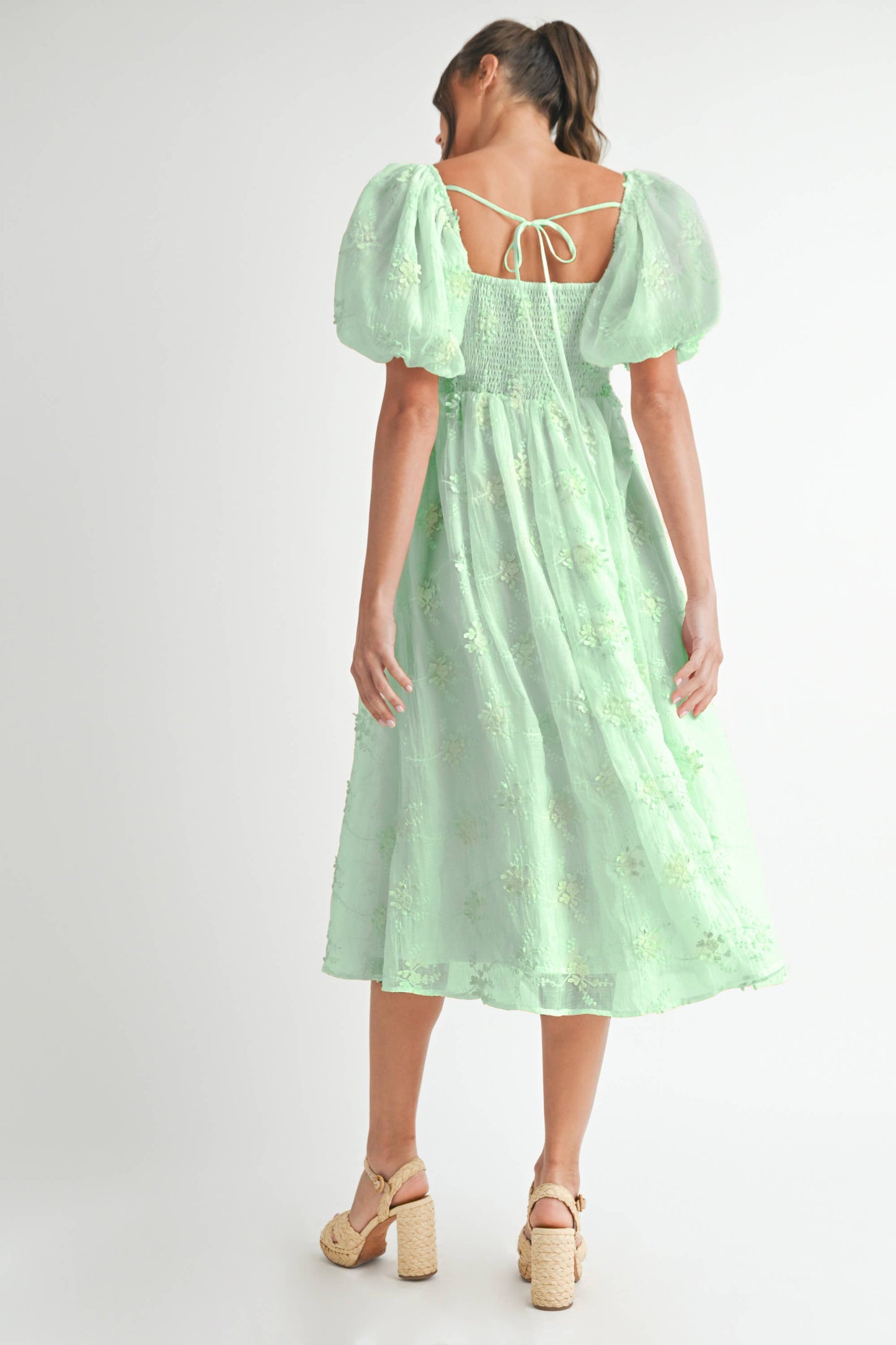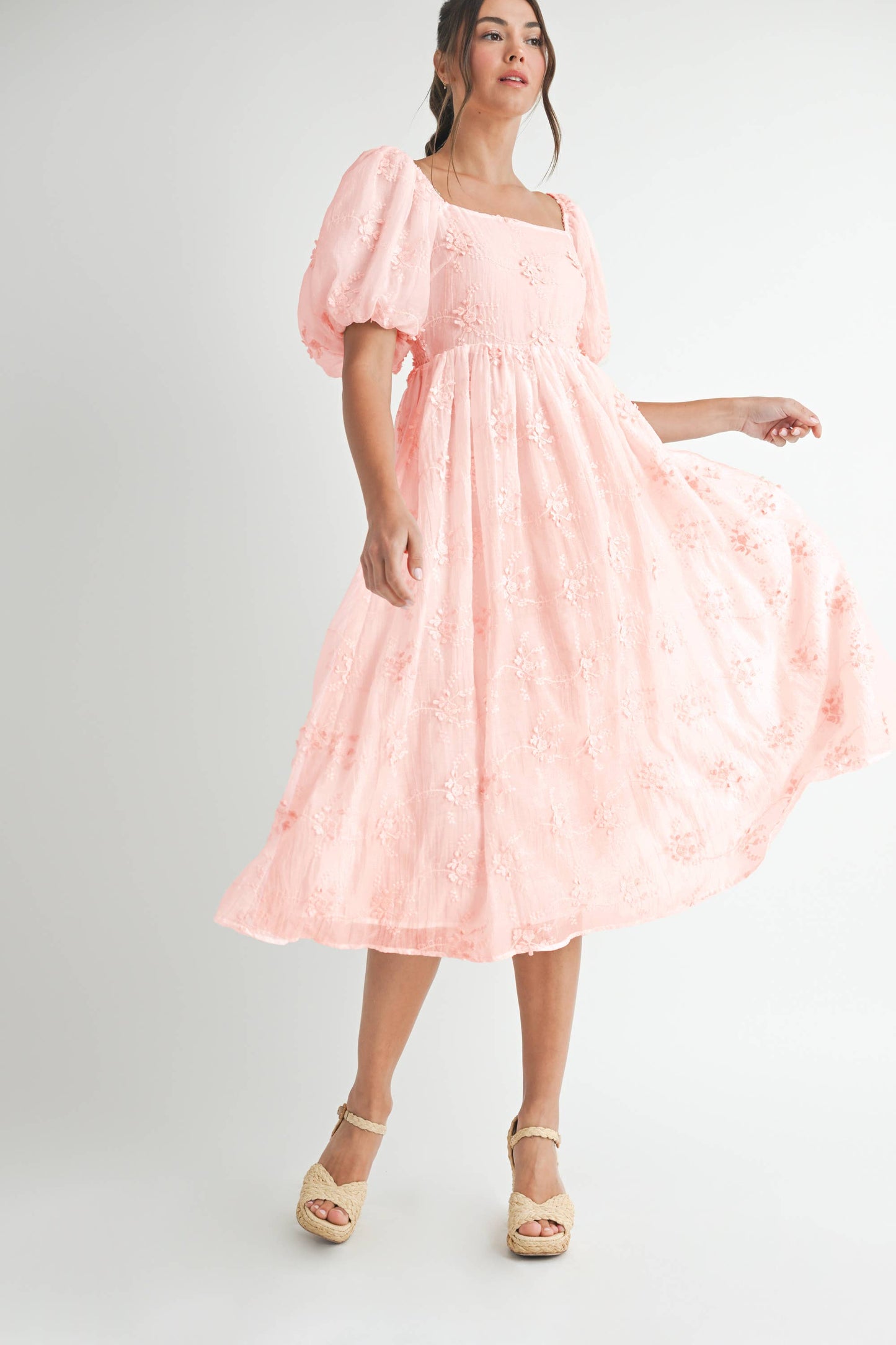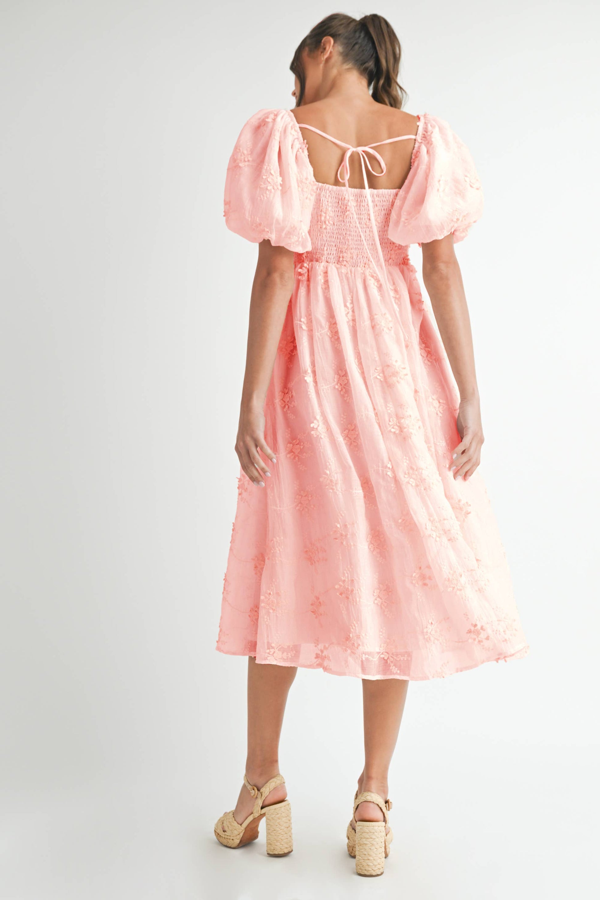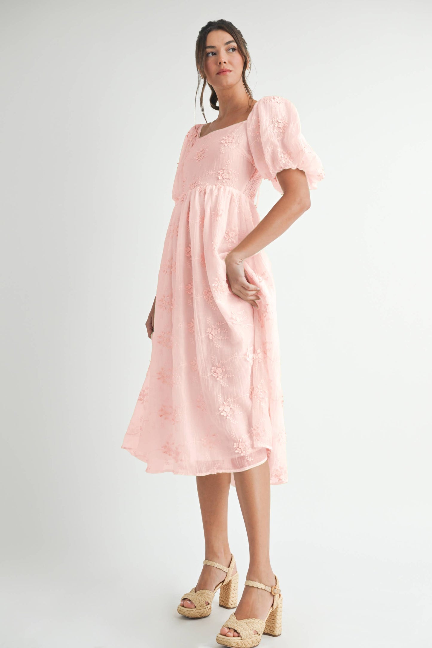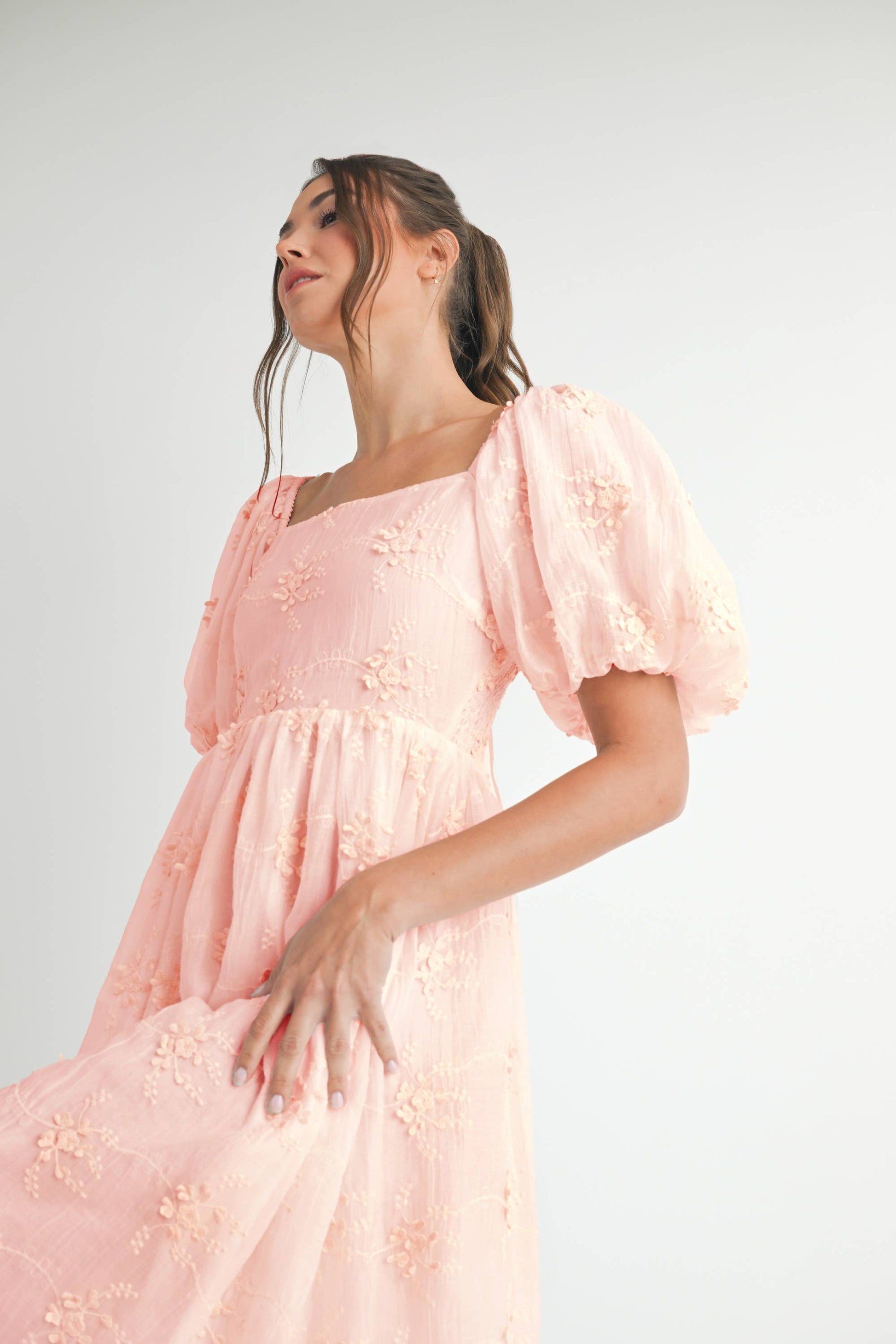 This short-sleeve midi dress is a stunning blend of elegance and comfort. It features intricate all-over embroidery that adds a delicate, feminine touch, creating a beautiful visual texture. The dress is fully lined for a smooth, flattering fit, while the back smocking detail provides a comfortable stretch and ensures a perfect, tailored finish. Versatile and stylish, it's ideal for a variety of occasions, from casual outings to more formal gatherings.