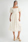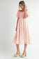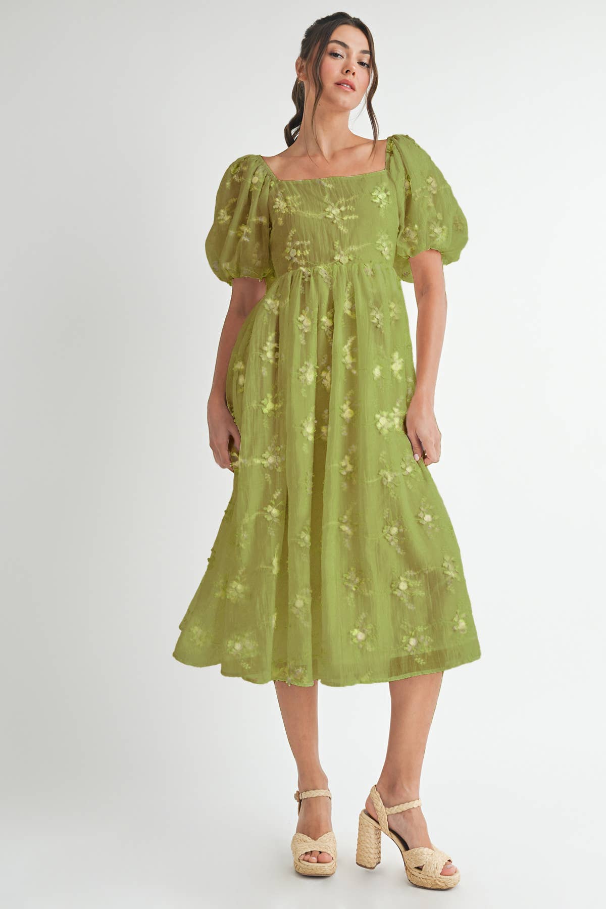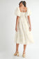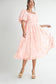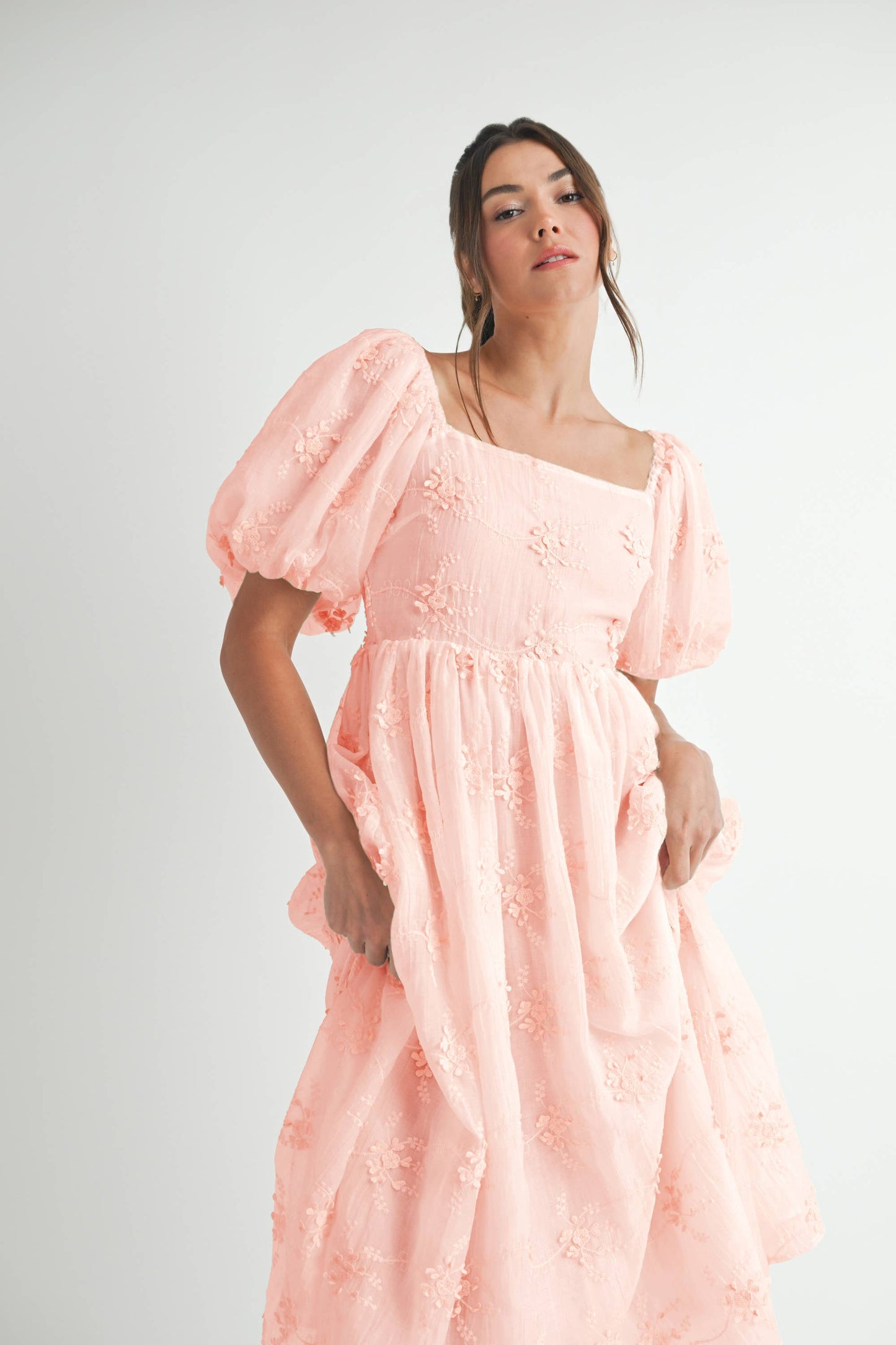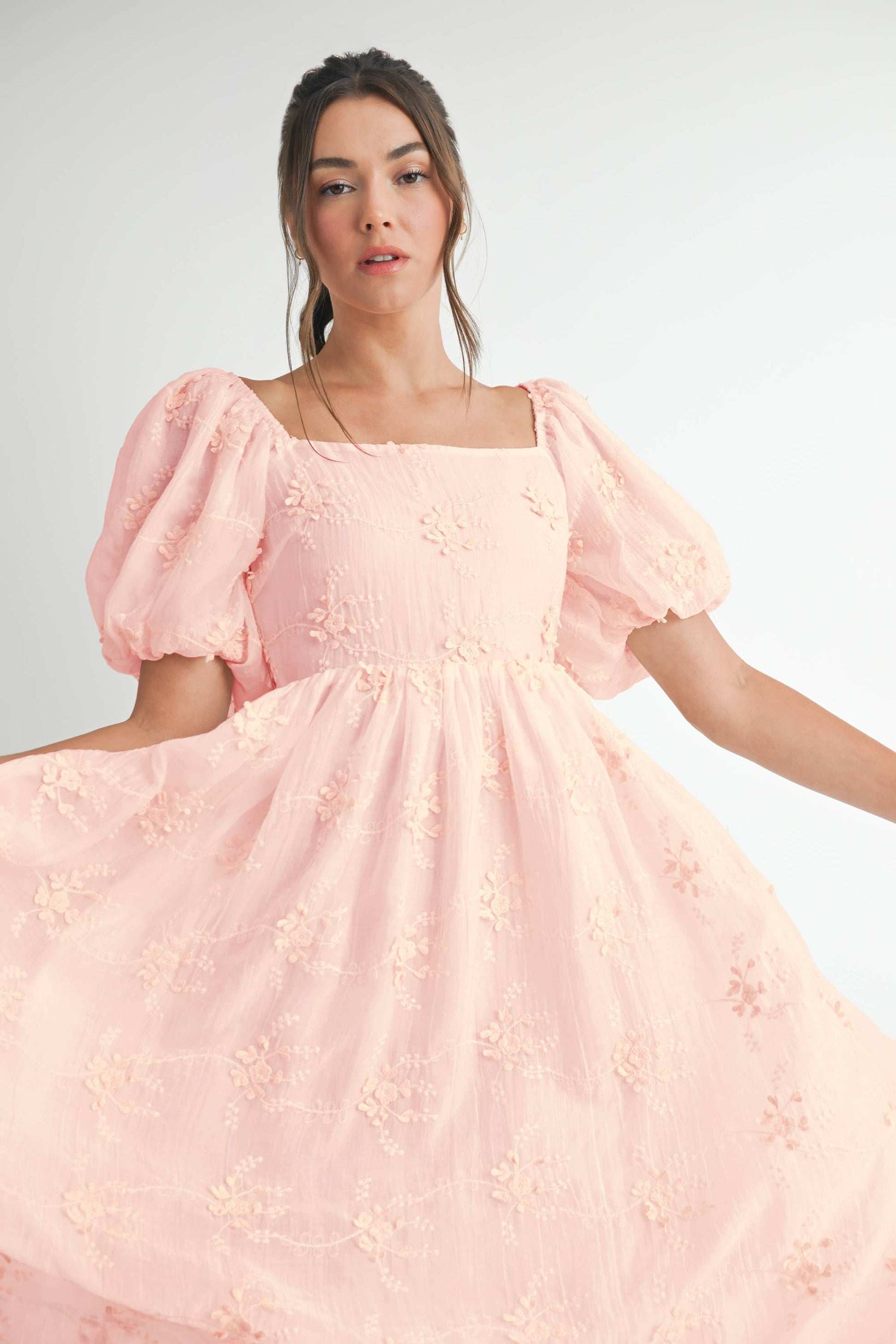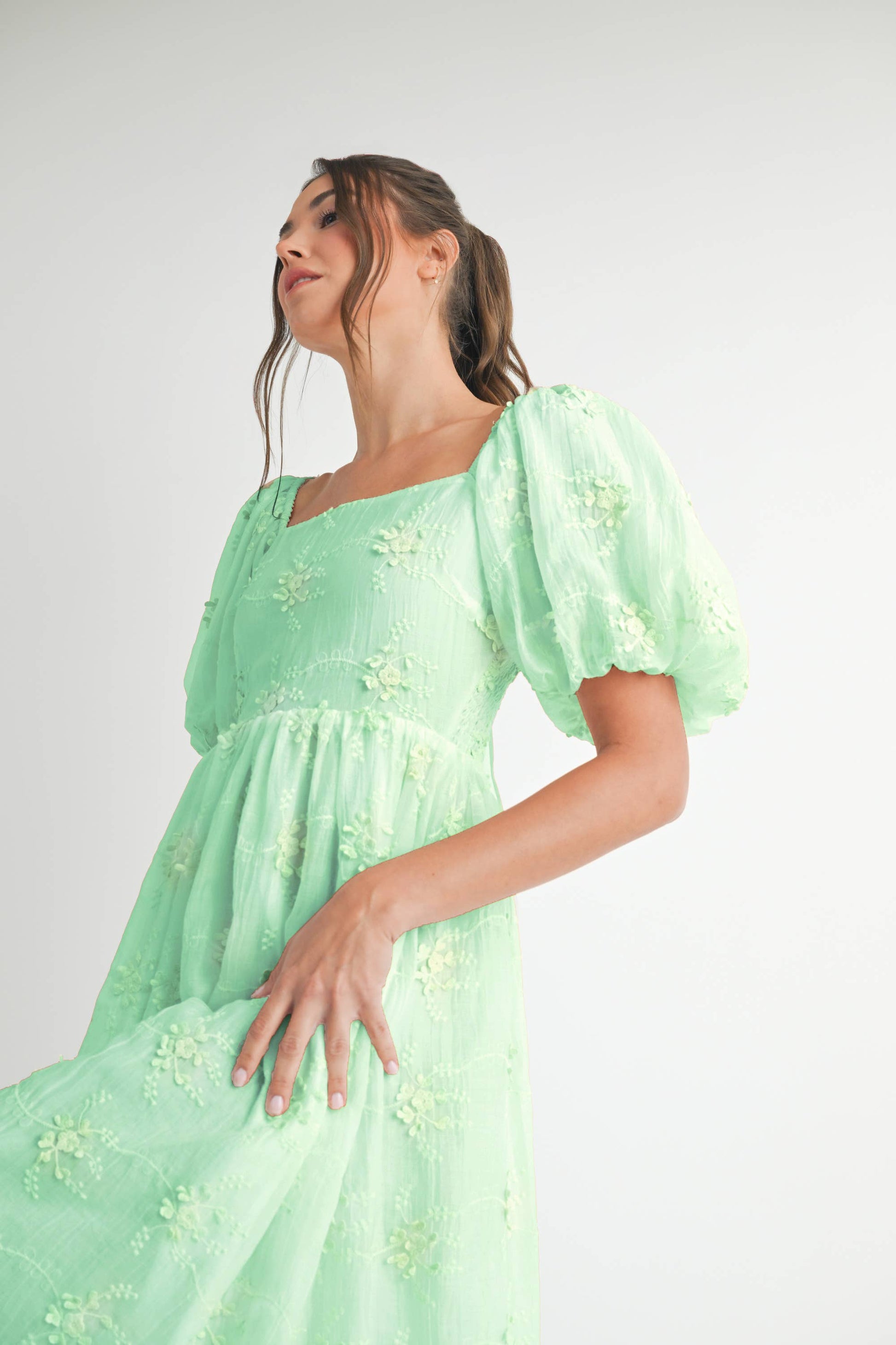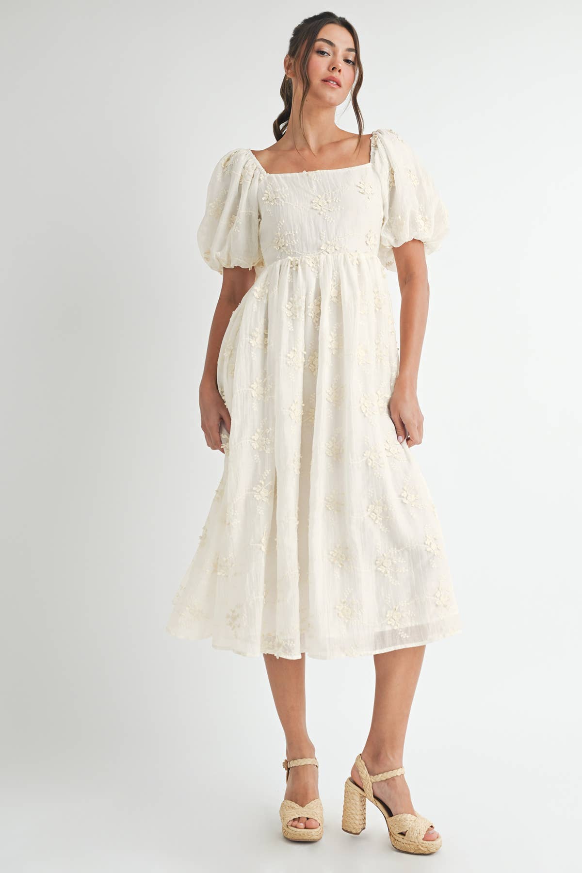 This short-sleeve midi dress is a stunning blend of elegance and comfort. It features intricate all-over embroidery that adds a delicate, feminine touch, creating a beautiful visual texture. The dress is fully lined for a smooth, flattering fit, while the back smocking detail provides a comfortable stretch and ensures a perfect, tailored finish. Versatile and stylish, it's ideal for a variety of occasions, from casual outings to more formal gatherings.