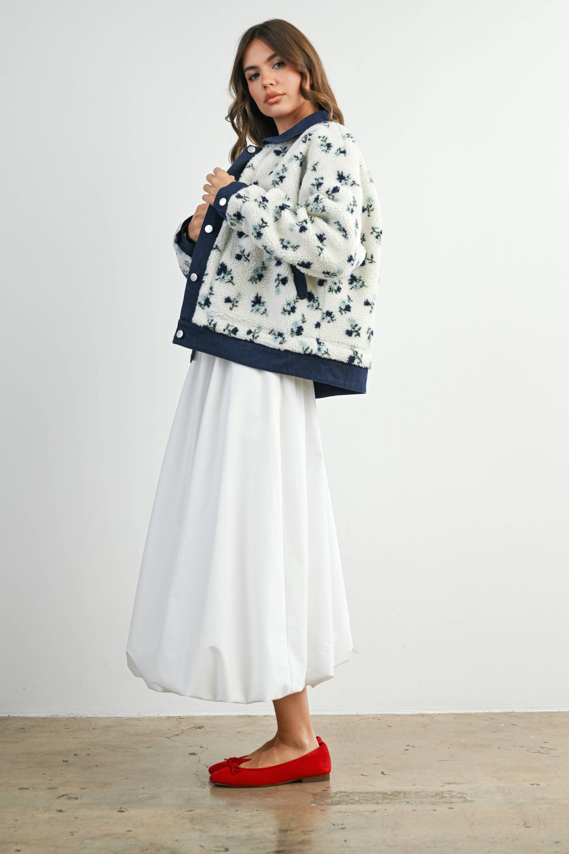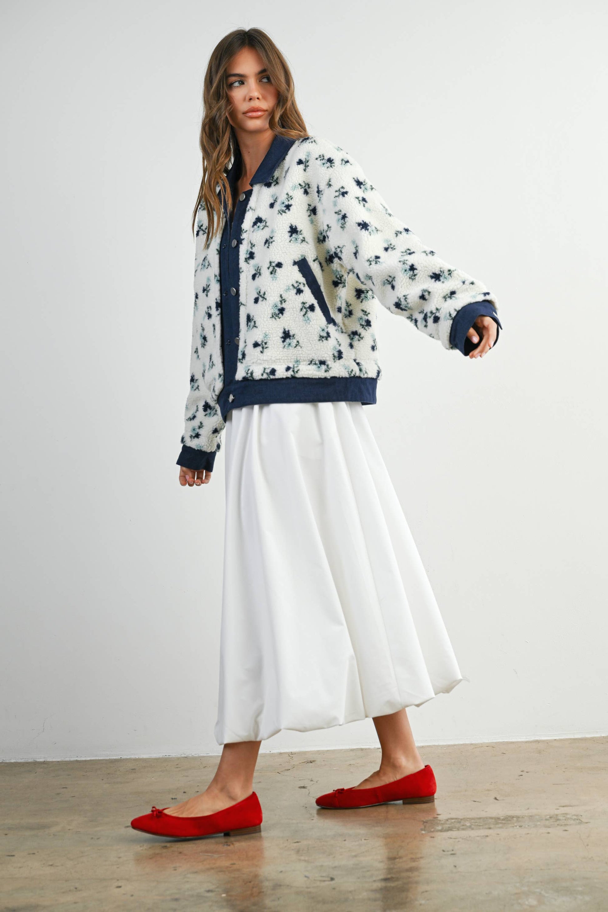 Add a touch of charm to your outerwear with this floral collared button-down jacket. Featuring a classic collar, front button closure, and an allover floral print, it blends structure with femininity. Perfect for layering over casual or dressy looks, this jacket offers both style and comfort.