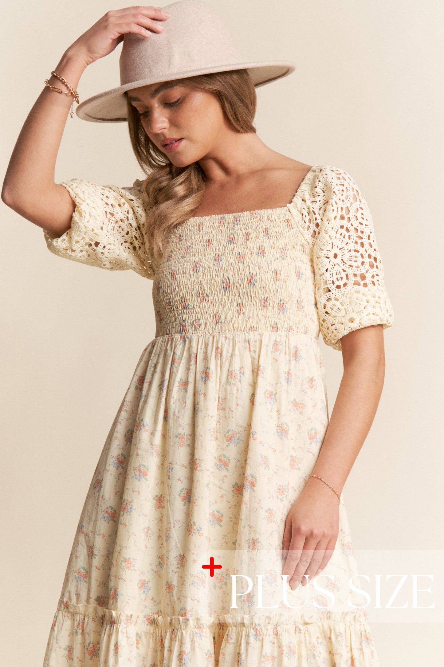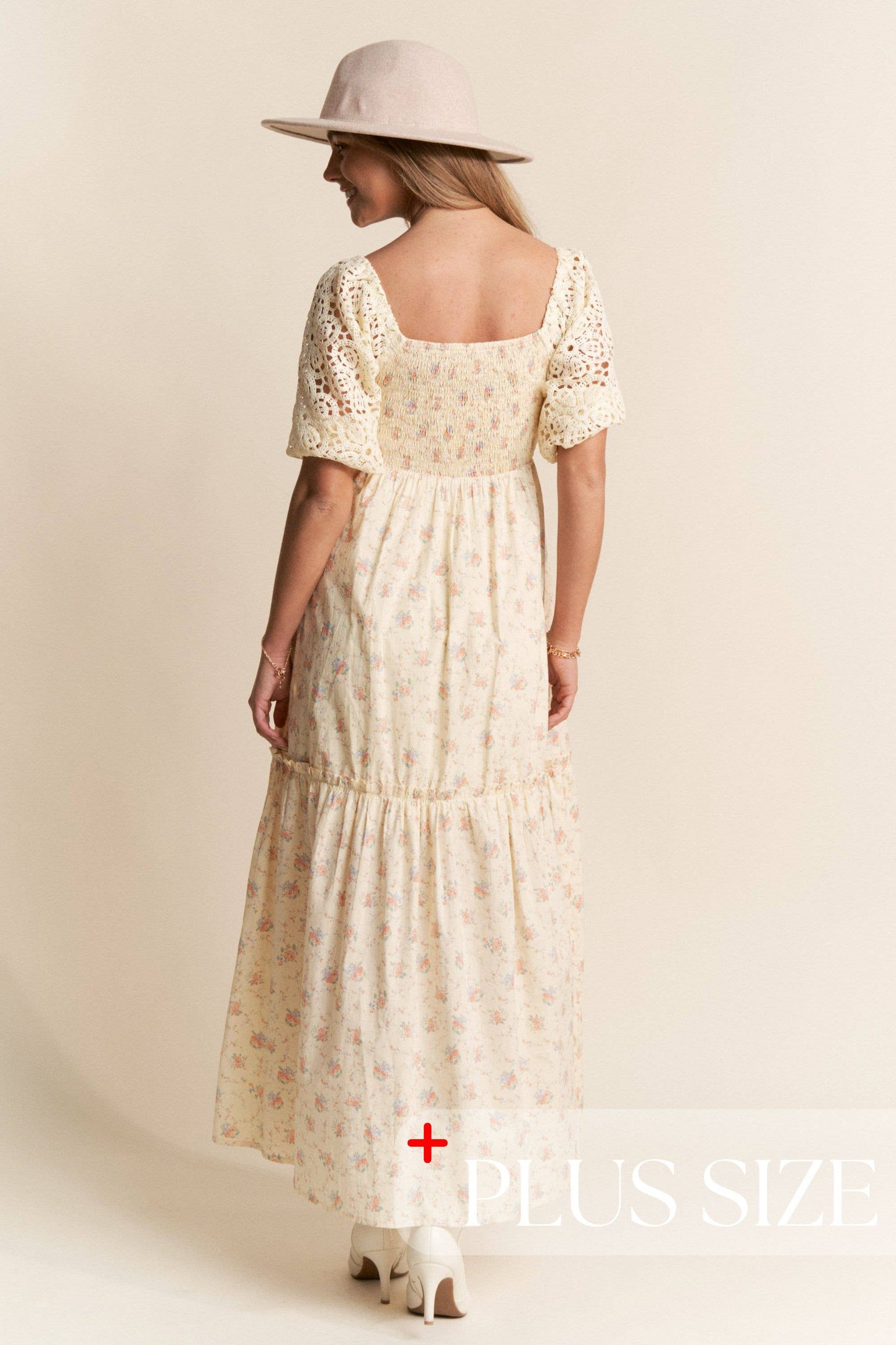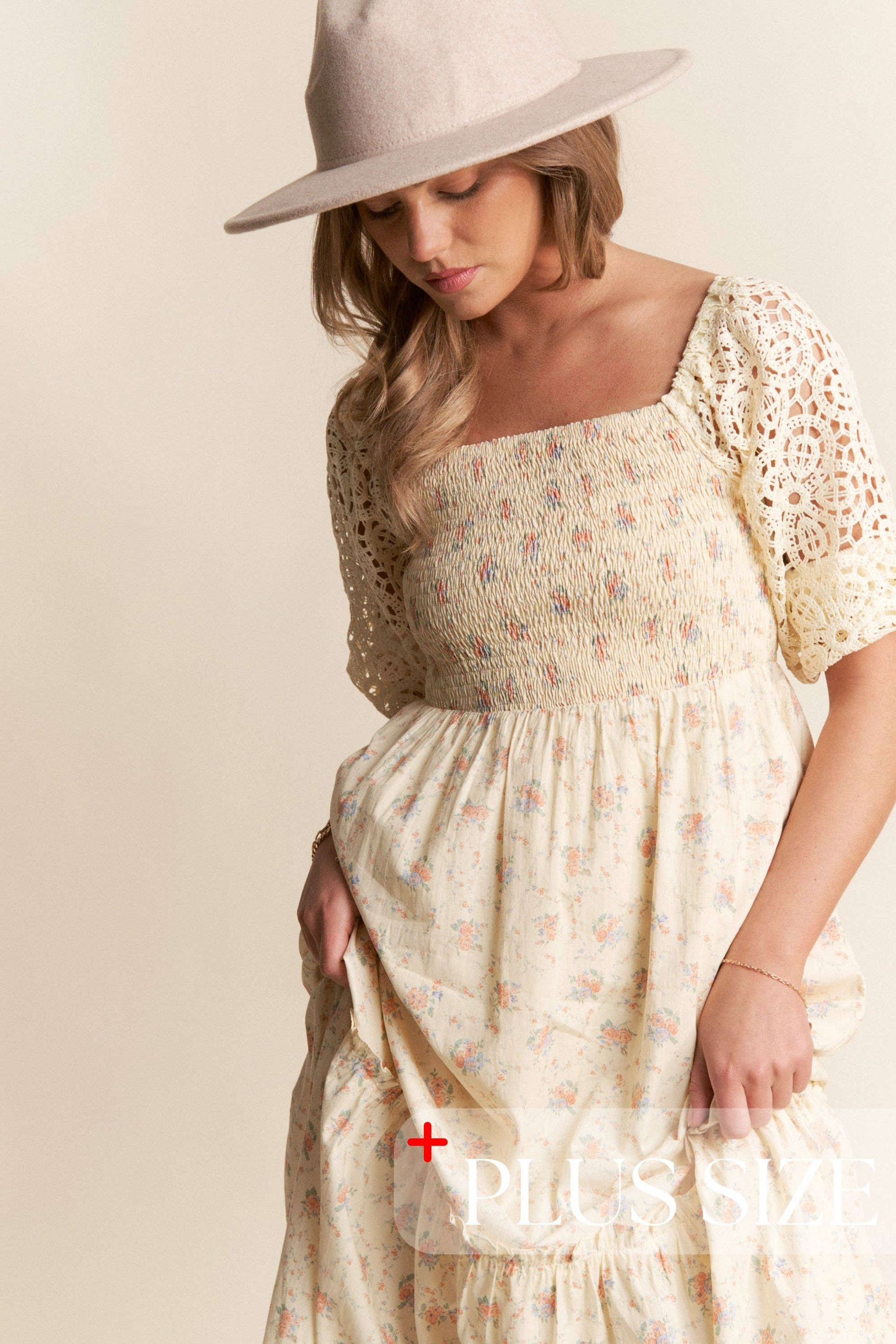 Women's plus size floral print smocked crochet lace trim 3/4 sleeves tiered maxi / midi dress with pockets.