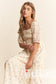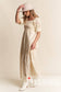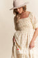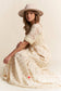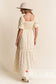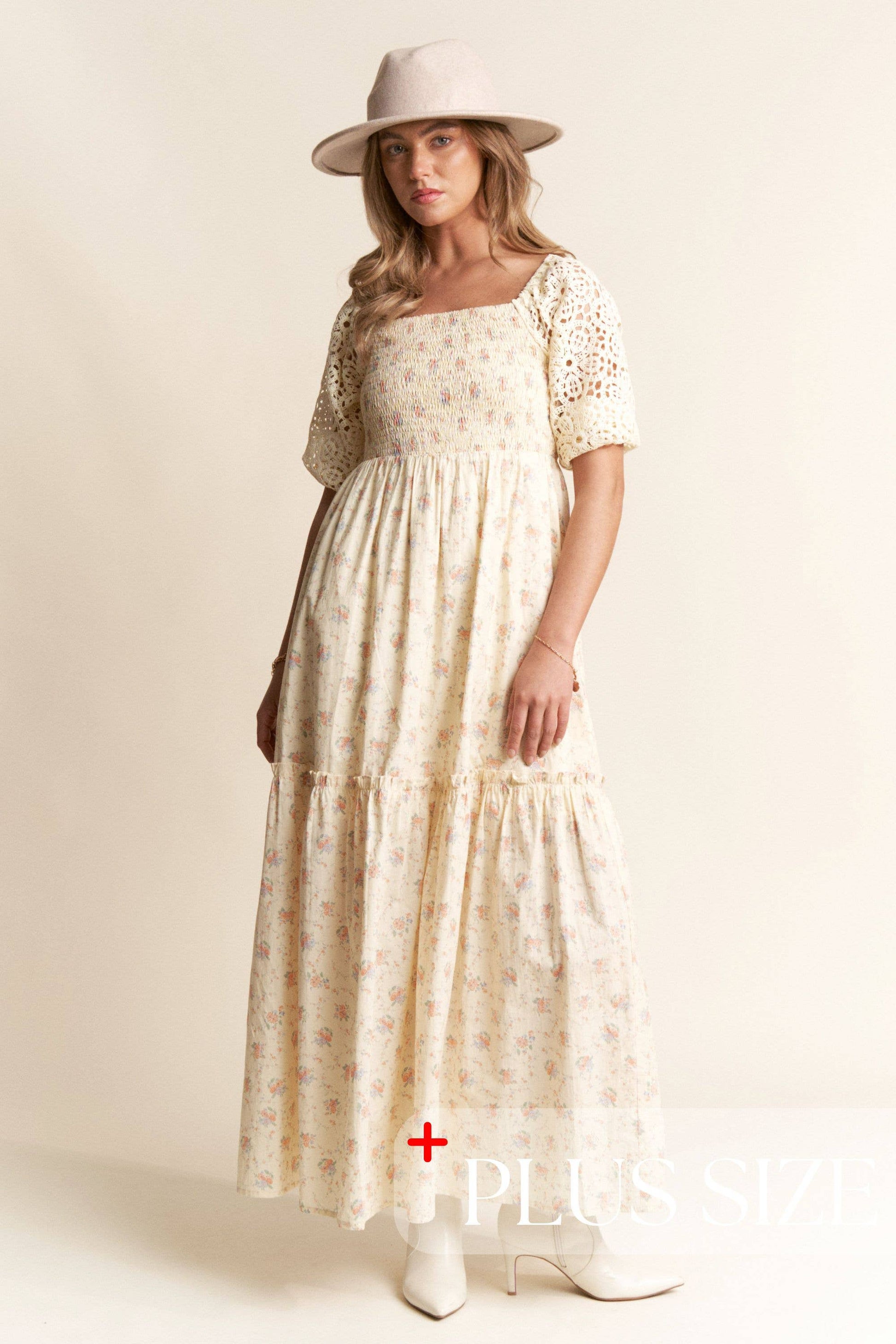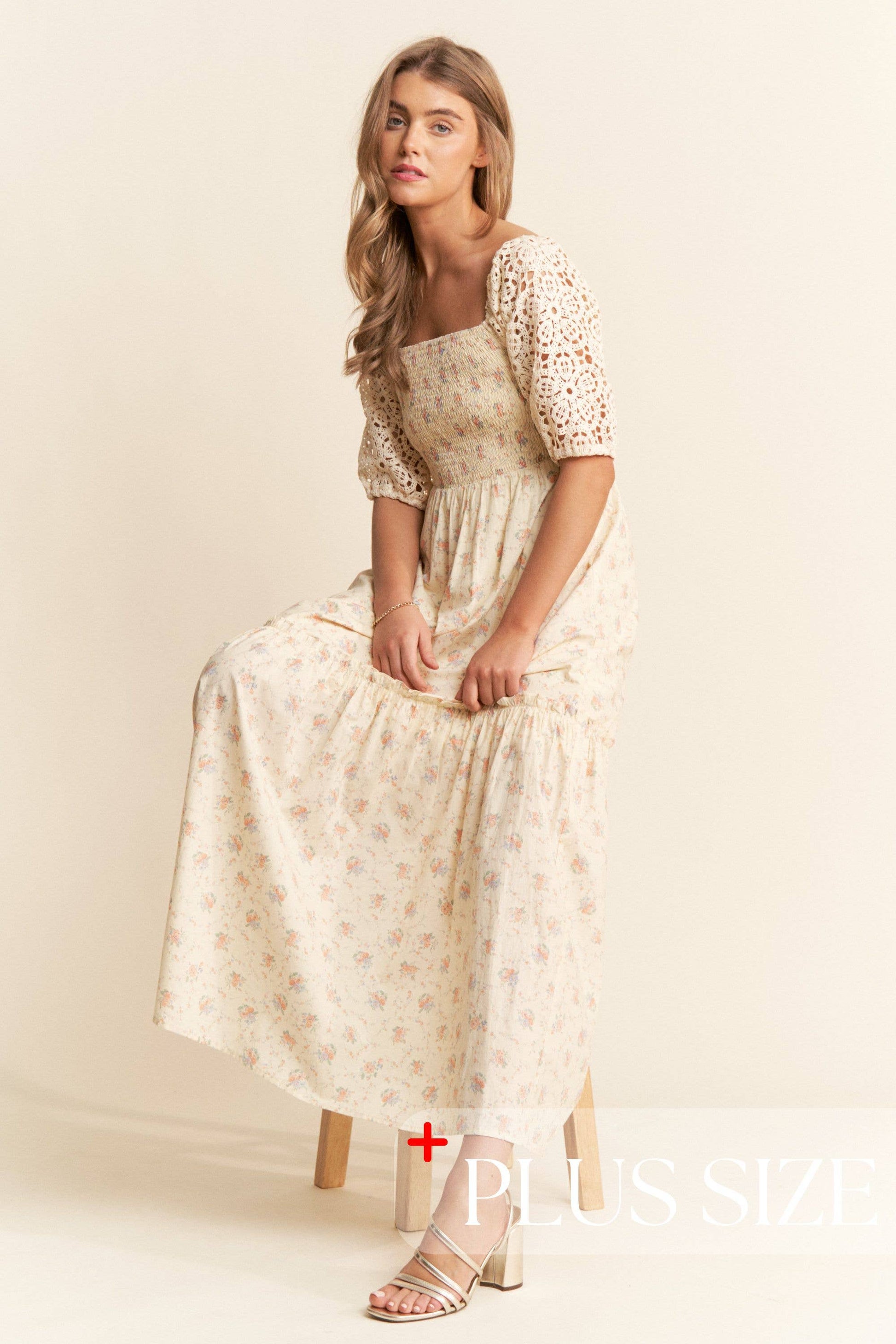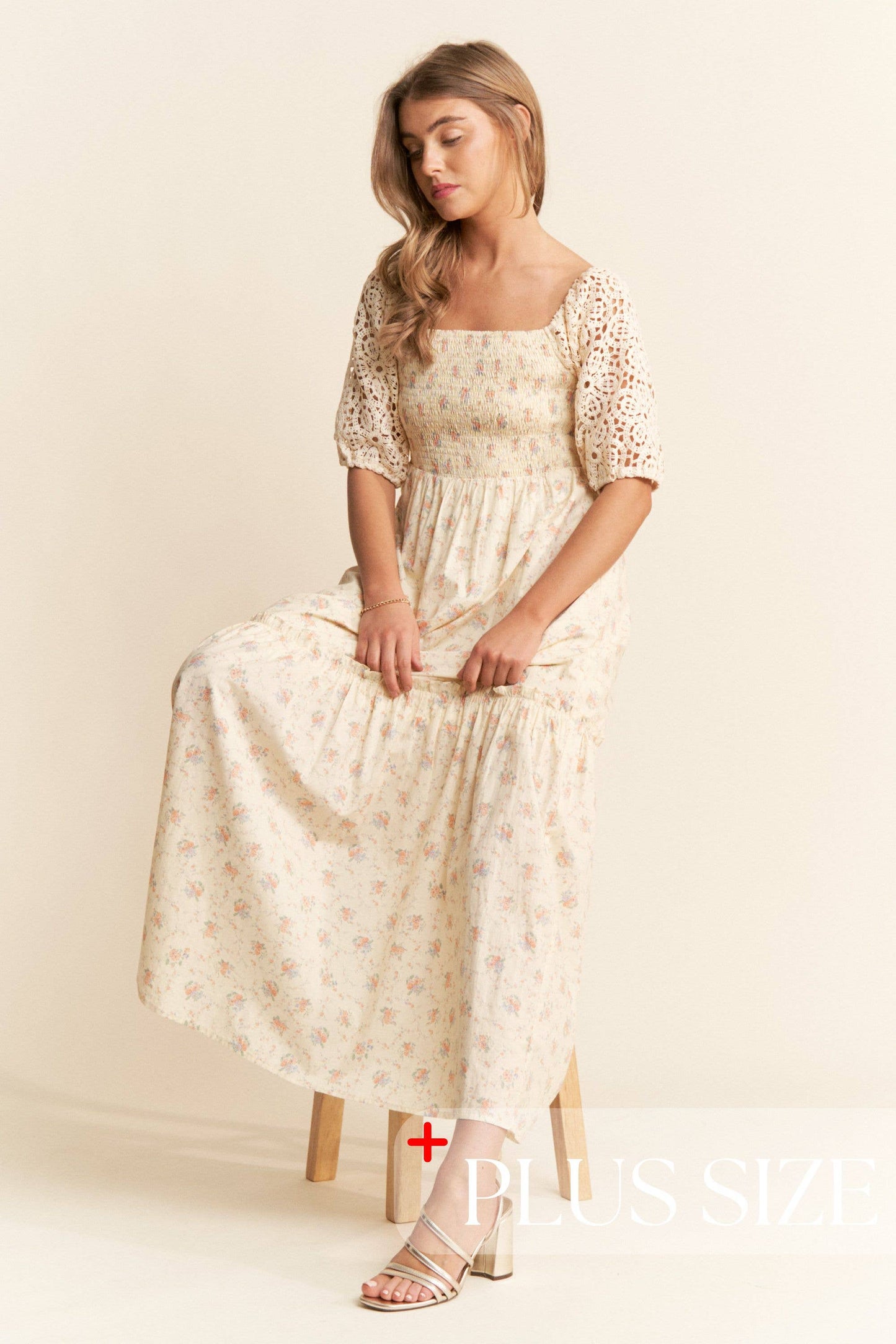 Women's plus size floral print smocked crochet lace trim 3/4 sleeves tiered maxi / midi dress with pockets.