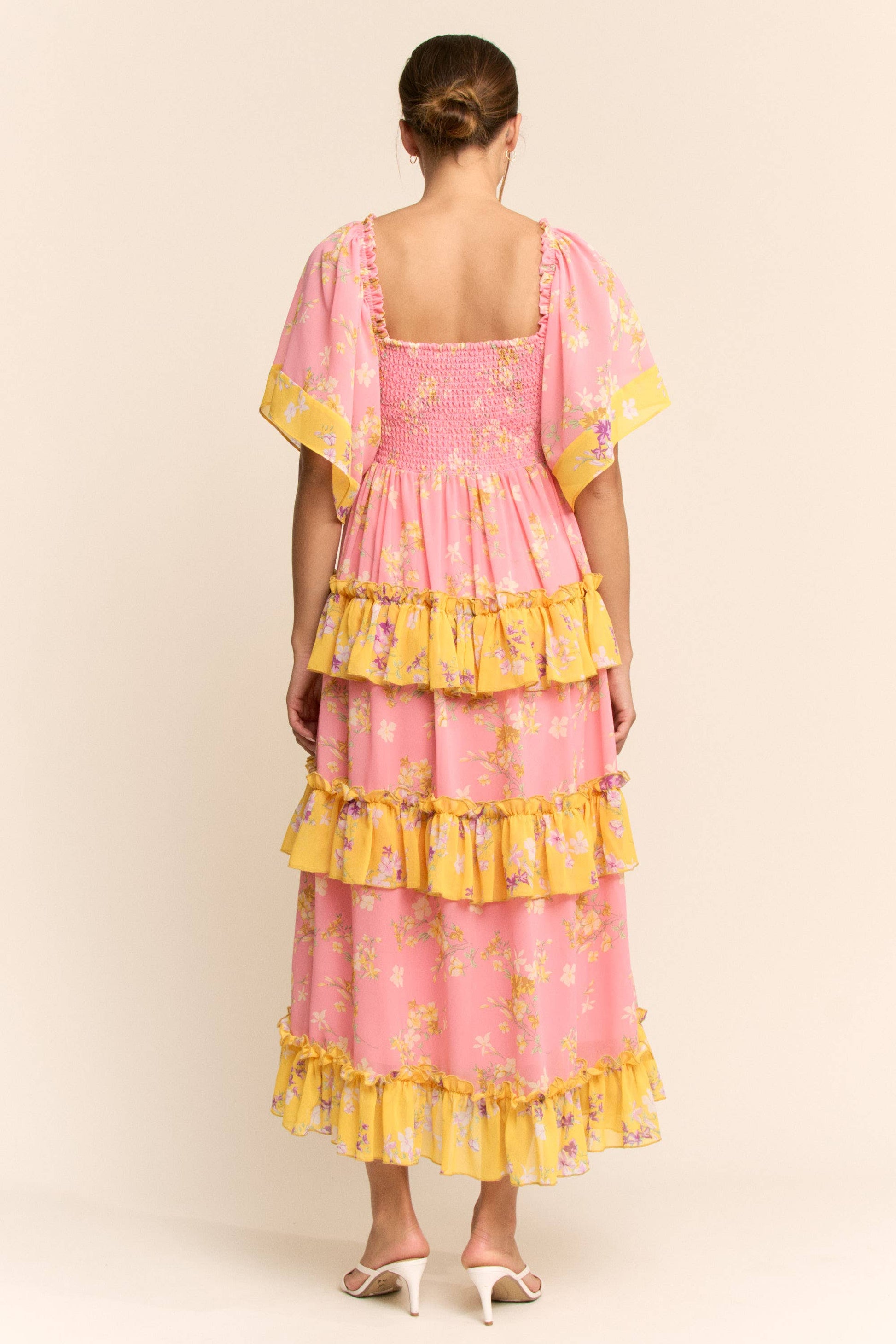 The Wildflower Maxi Dress is a dreamy, effortlessly feminine piece that brings soft romance to every step. Crafted from lightweight chiffon, this maxi features a delicate floral print, flutter sleeves, and layered ruffle tiers that create a flowing, graceful silhouette. The smocked back ensures a comfortable, flattering fit, while the airy design makes it perfect for everything from garden parties to weekend brunches.