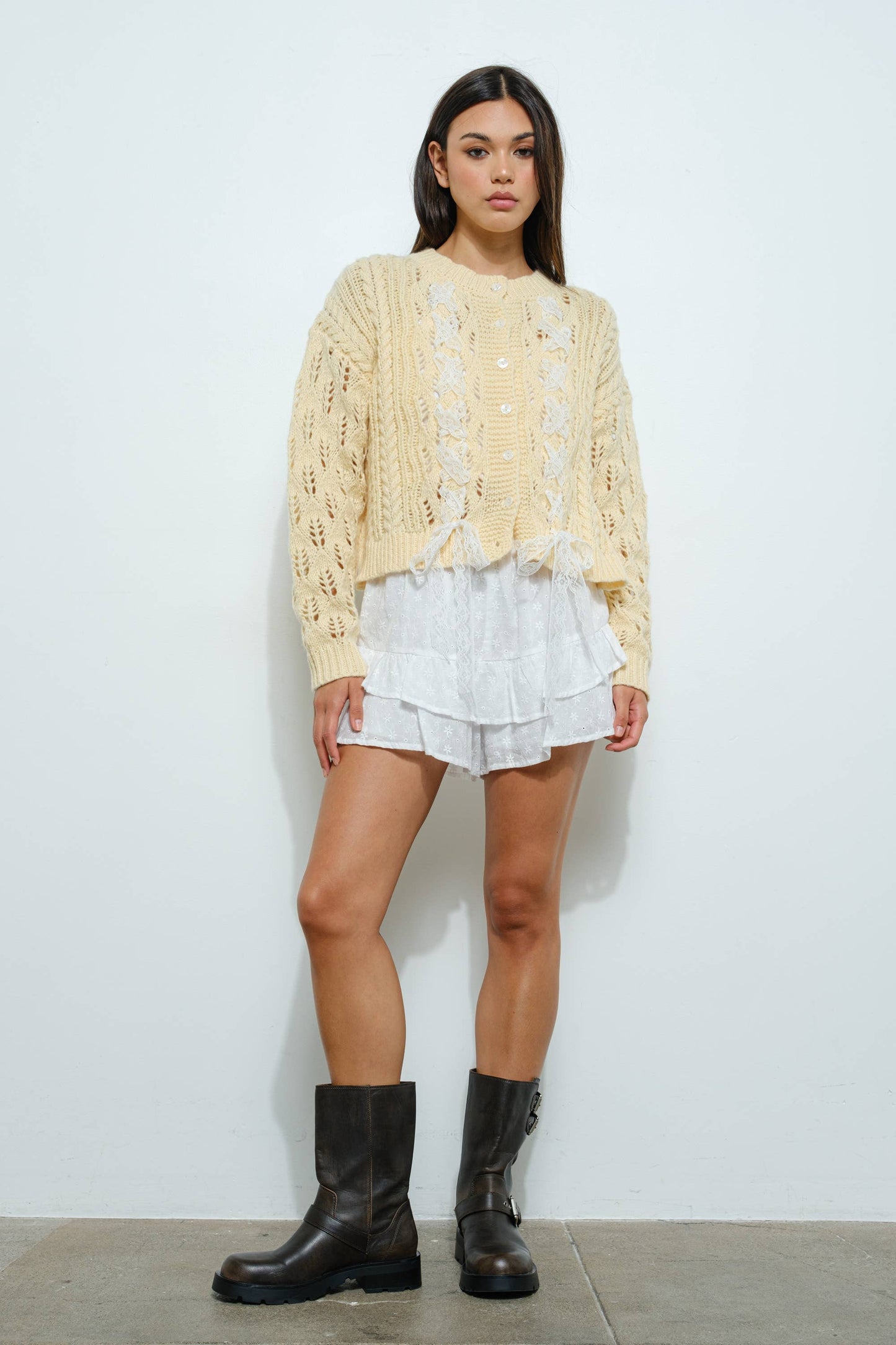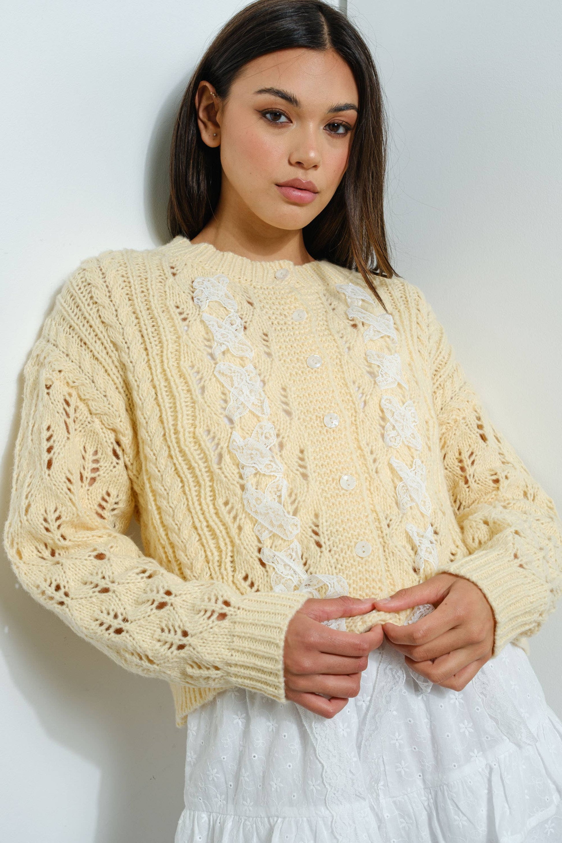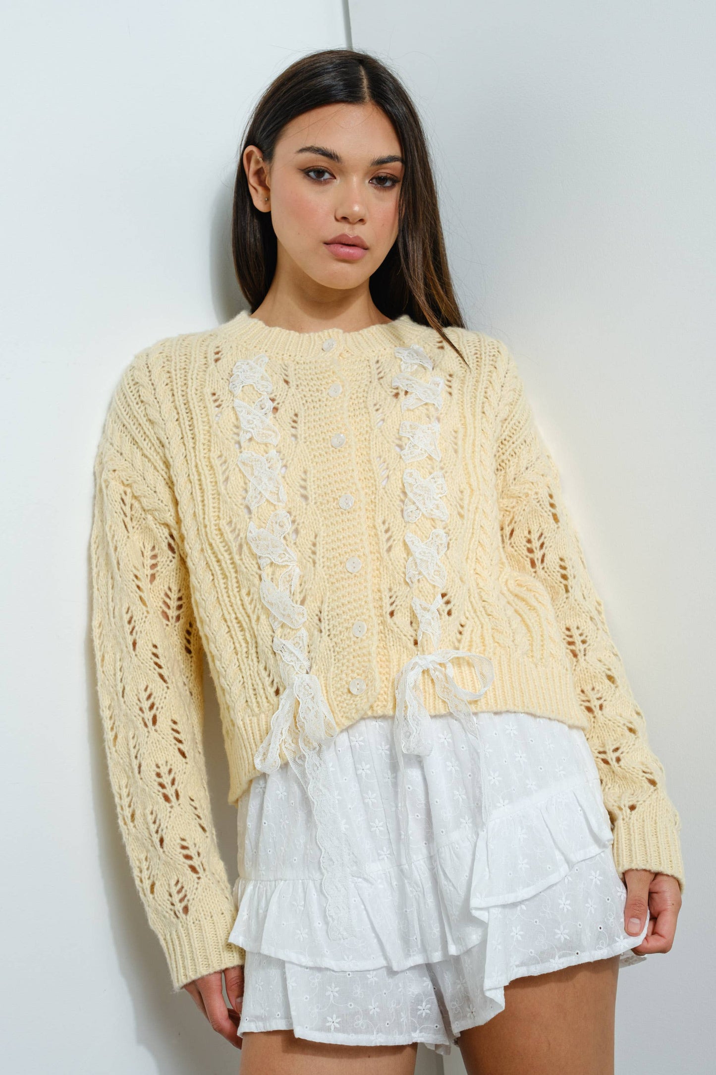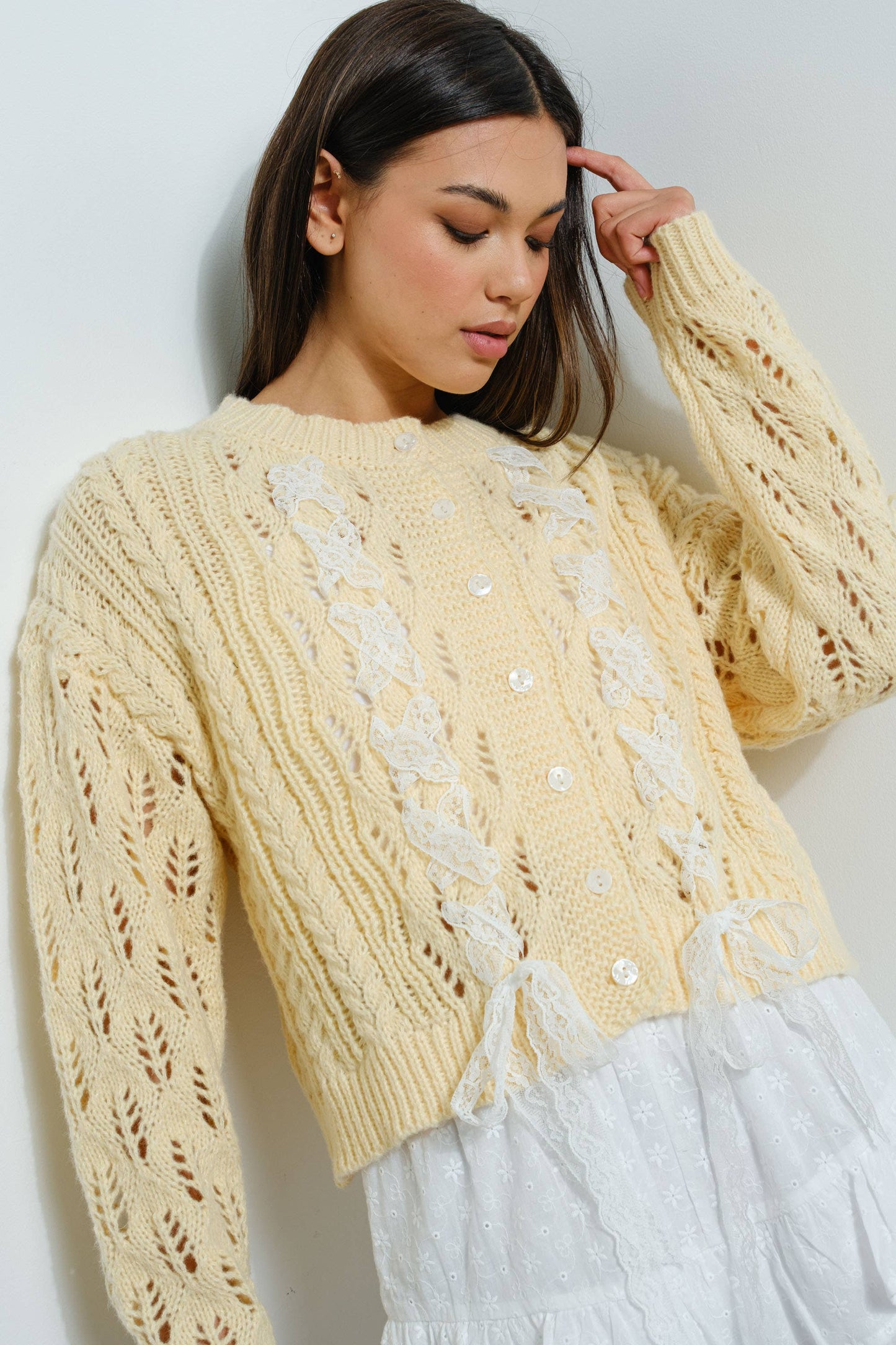 Cozy meets charm in the Lemon Meringue Cardigan — a sweet take on a classic knit. This light yellow cable knit sweater features romantic lace trim detailing along the edges, giving it a soft, feminine twist. Designed with long sleeves and an oversized fit, it’s the perfect layering piece for breezy mornings or slow afternoons. Whether draped over a dress or styled with denim, this cardigan adds a hint of vintage sweetness to your look.
