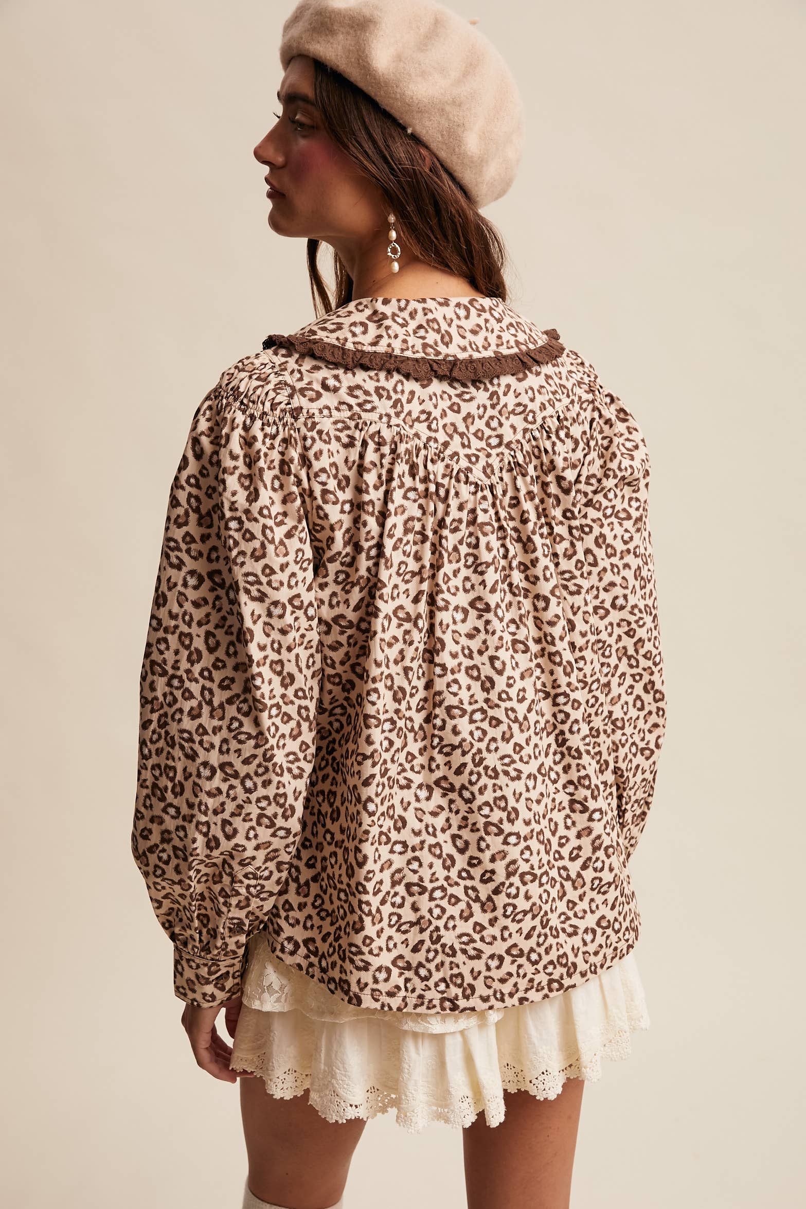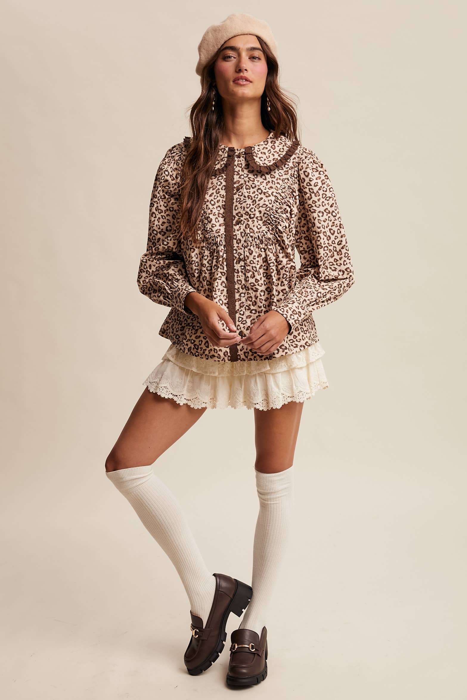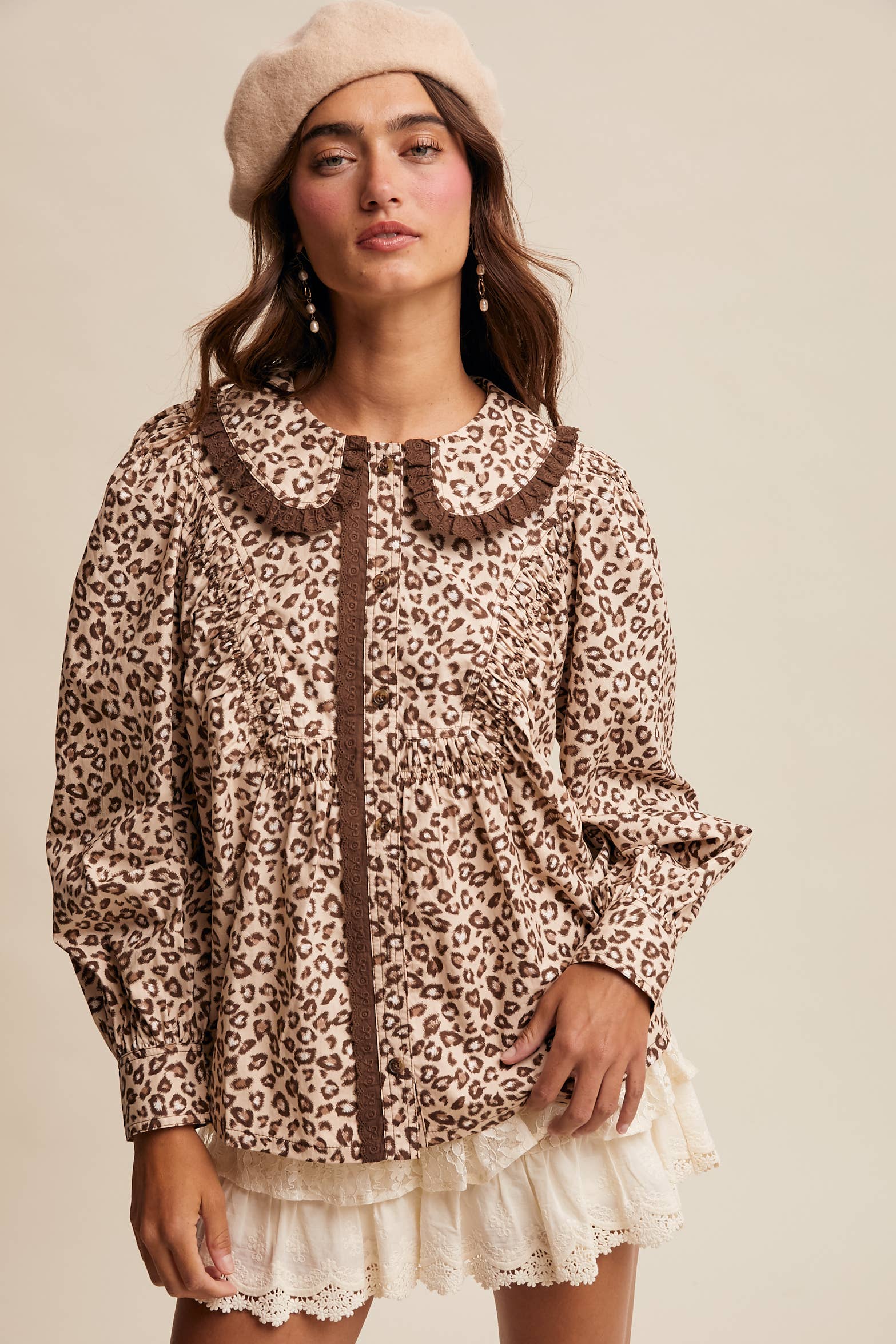 This standout top balances sweetness and sass with its leopard motif and doll-like silhouette-perfect for dressing up denim skirts or pairing with tailored bottoms for a bold yet wearable statement. Try it layered under a denim dress or a blazer to add a trend-forward twist to your everyday look.