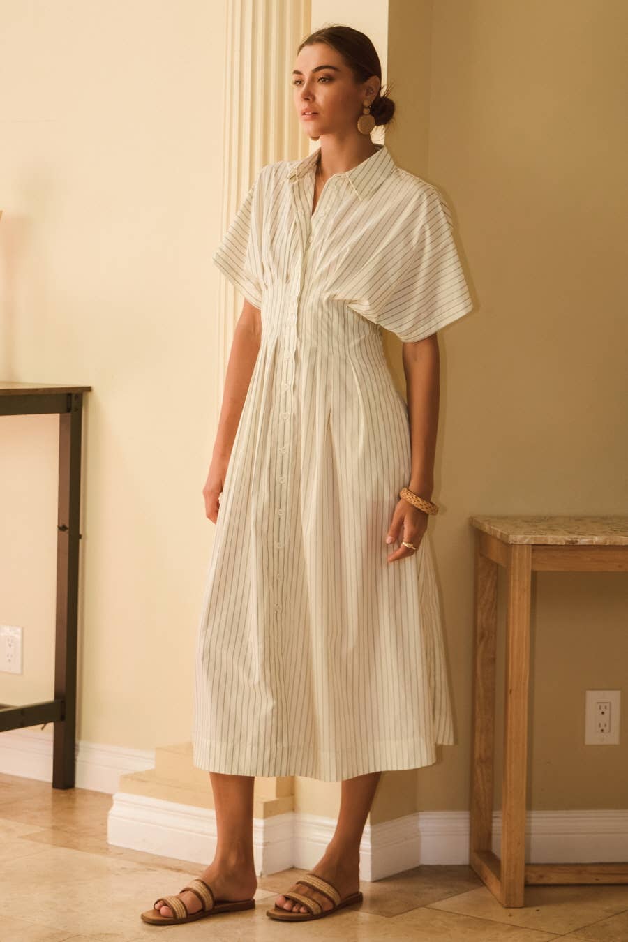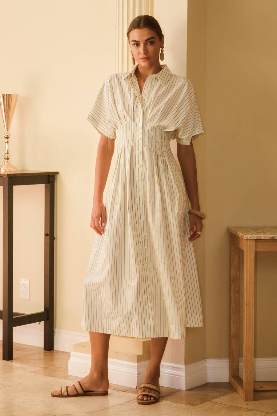 The Catie Pinstripe Midi Shirt Dress is a modern take on classic sophistication. Crafted from breathable cotton poplin in an ivory and black pinstripe design, this midi dress features a structured shirt-style silhouette with a smocked back for a flattering fit. Perfect for work, brunch, or an effortlessly chic everyday look.