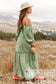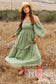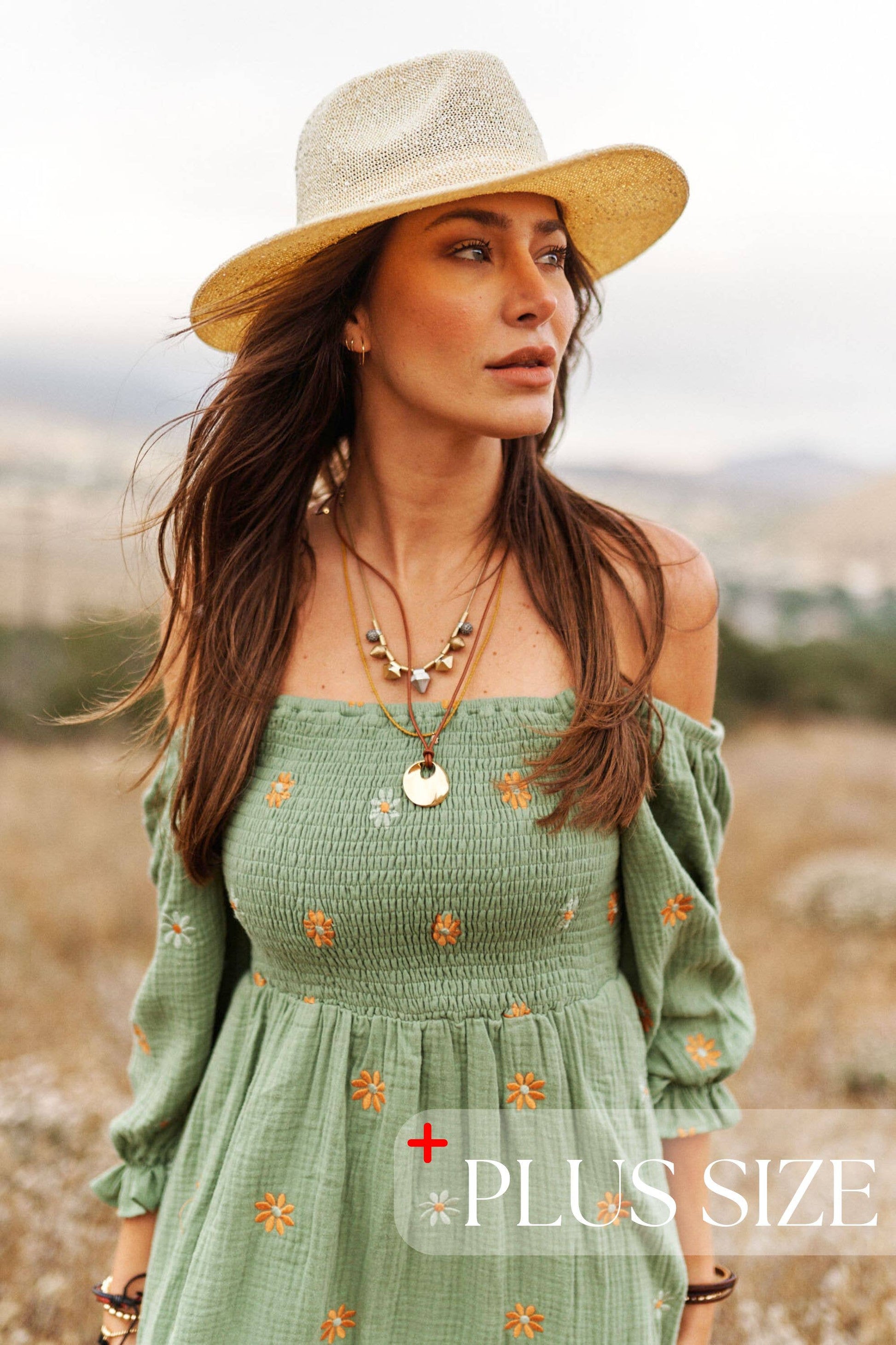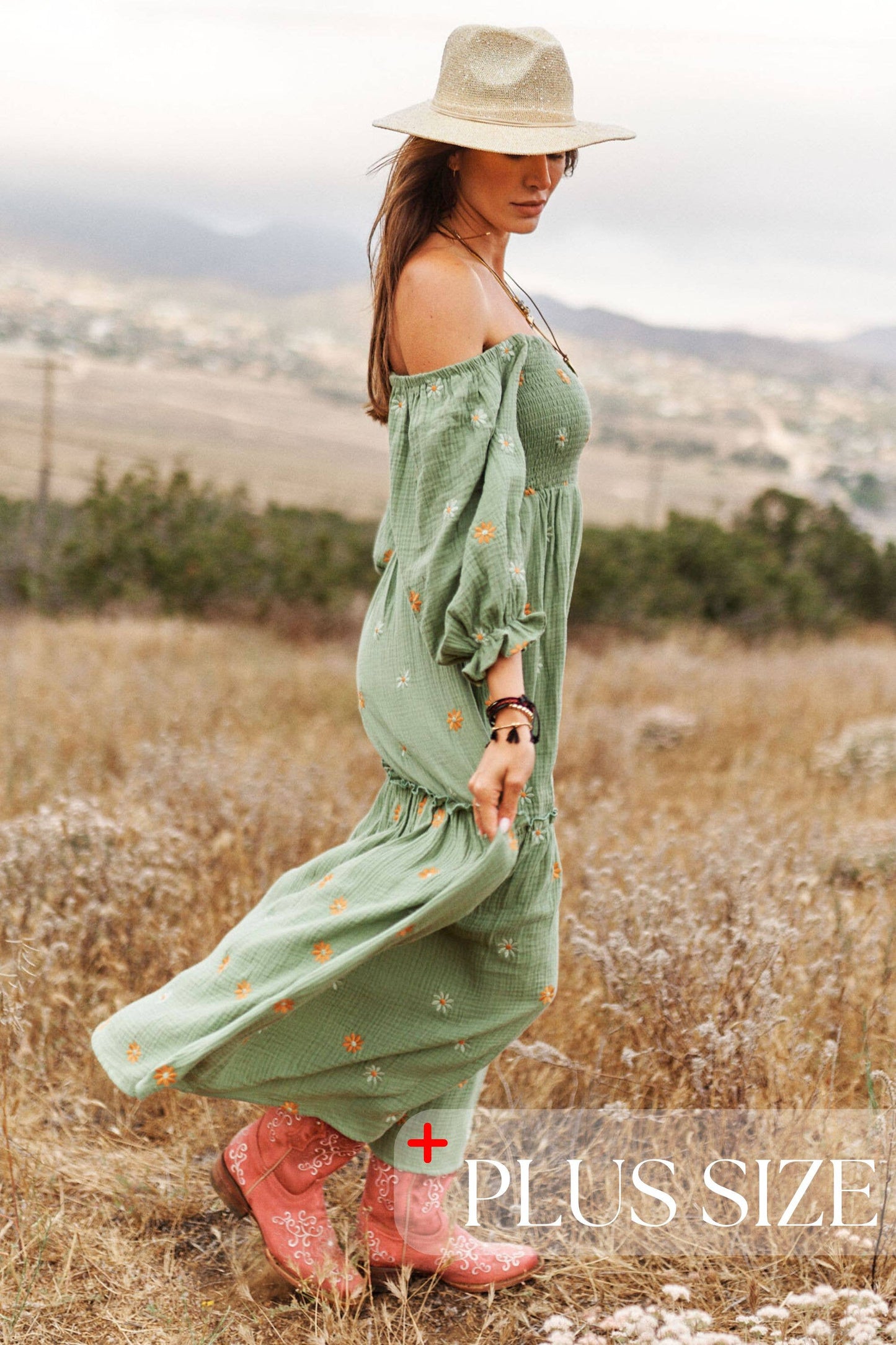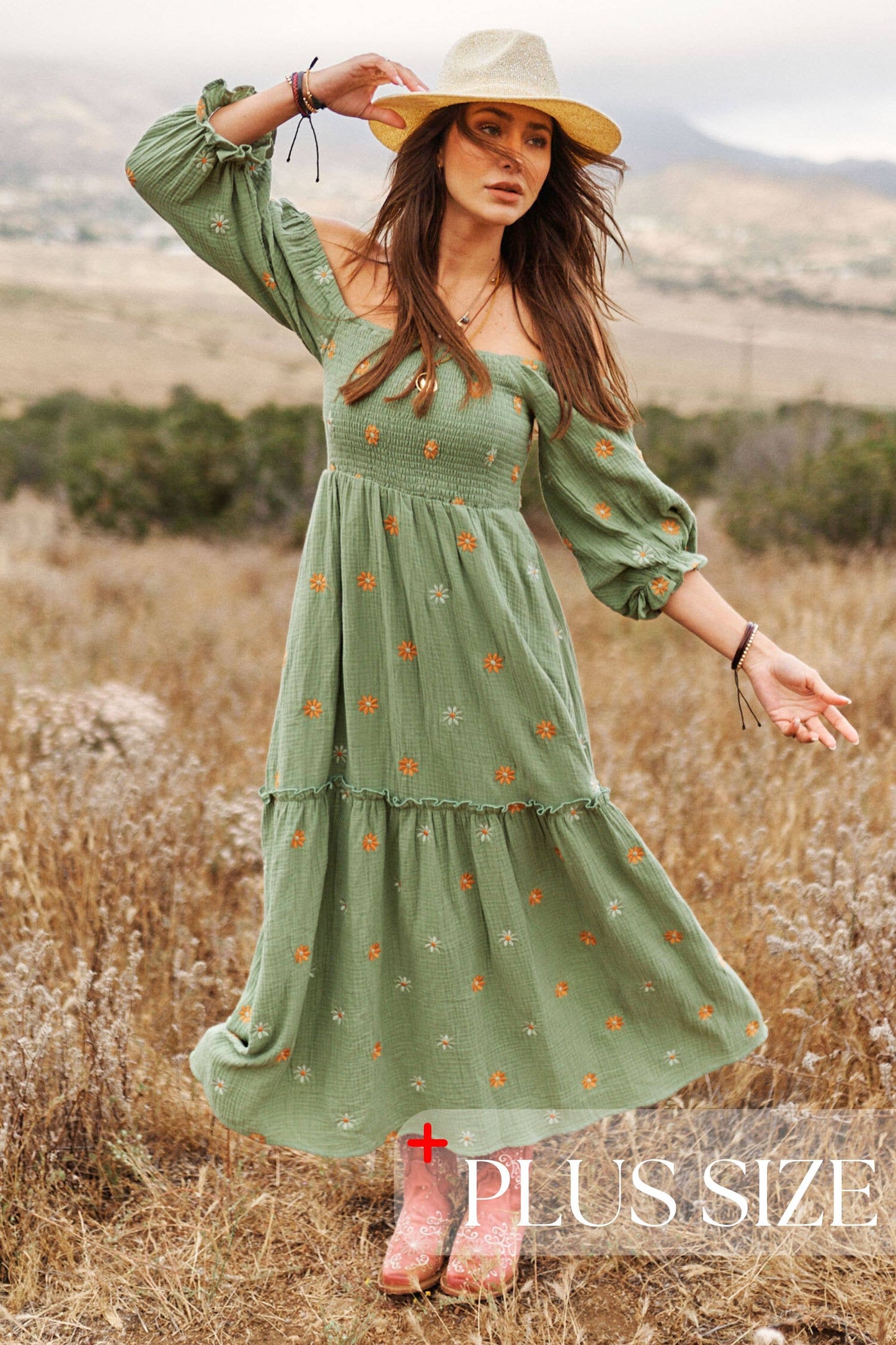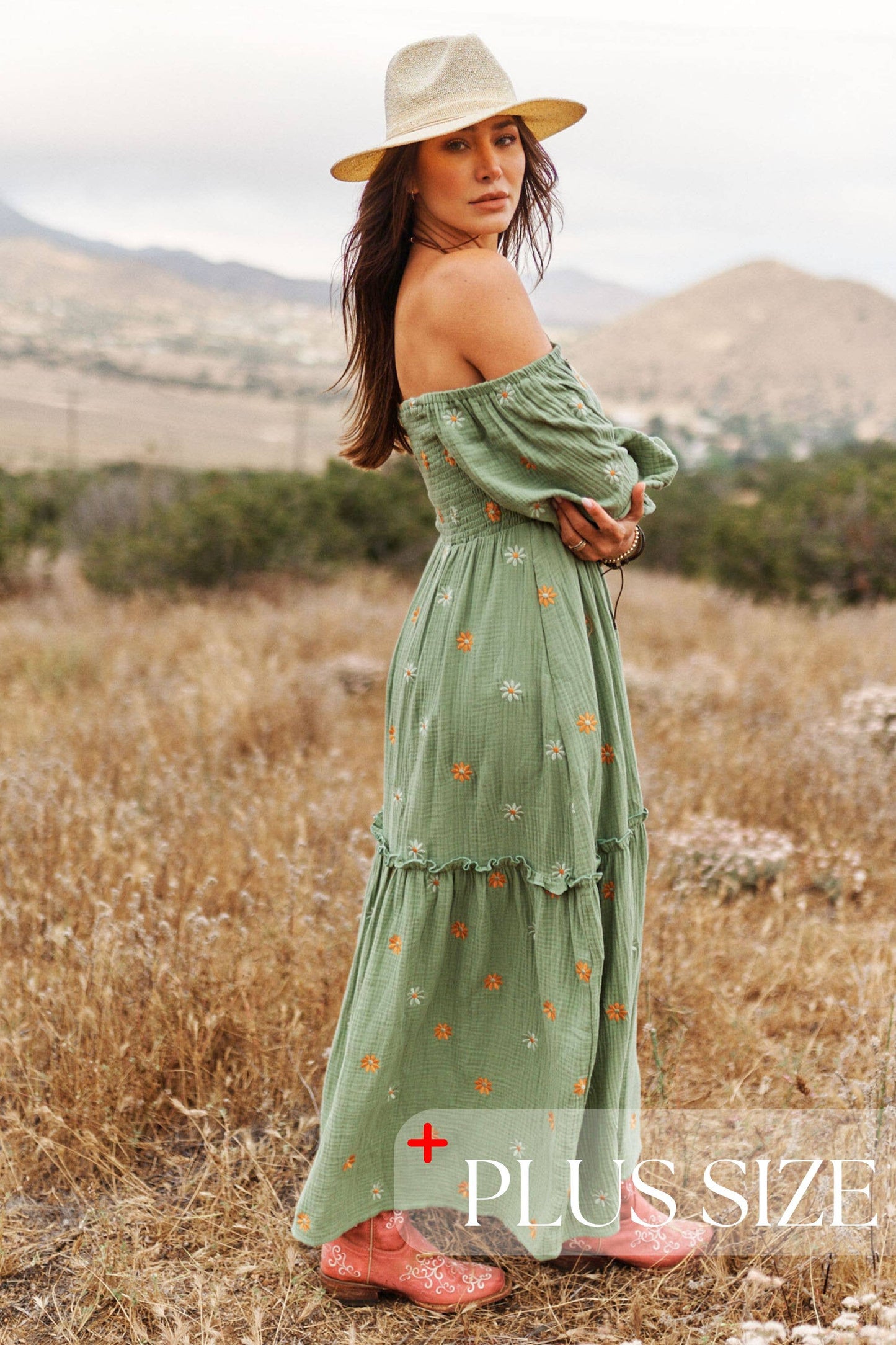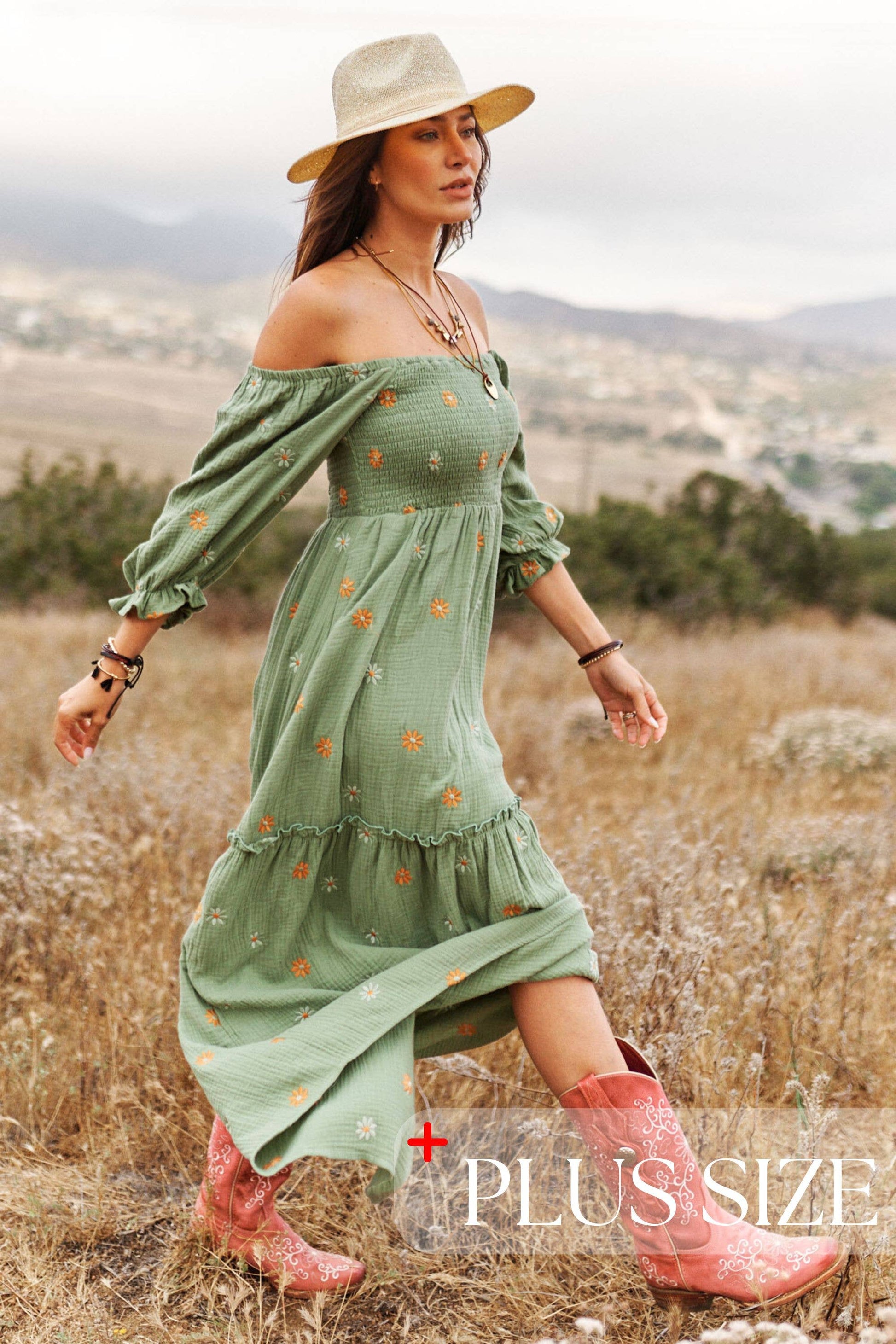 Women's plus size maxi tiered dress. Designed with embroidered flowers. Half sleeve with elastic ruffle hem. Smocked top bodice and functional pockets.