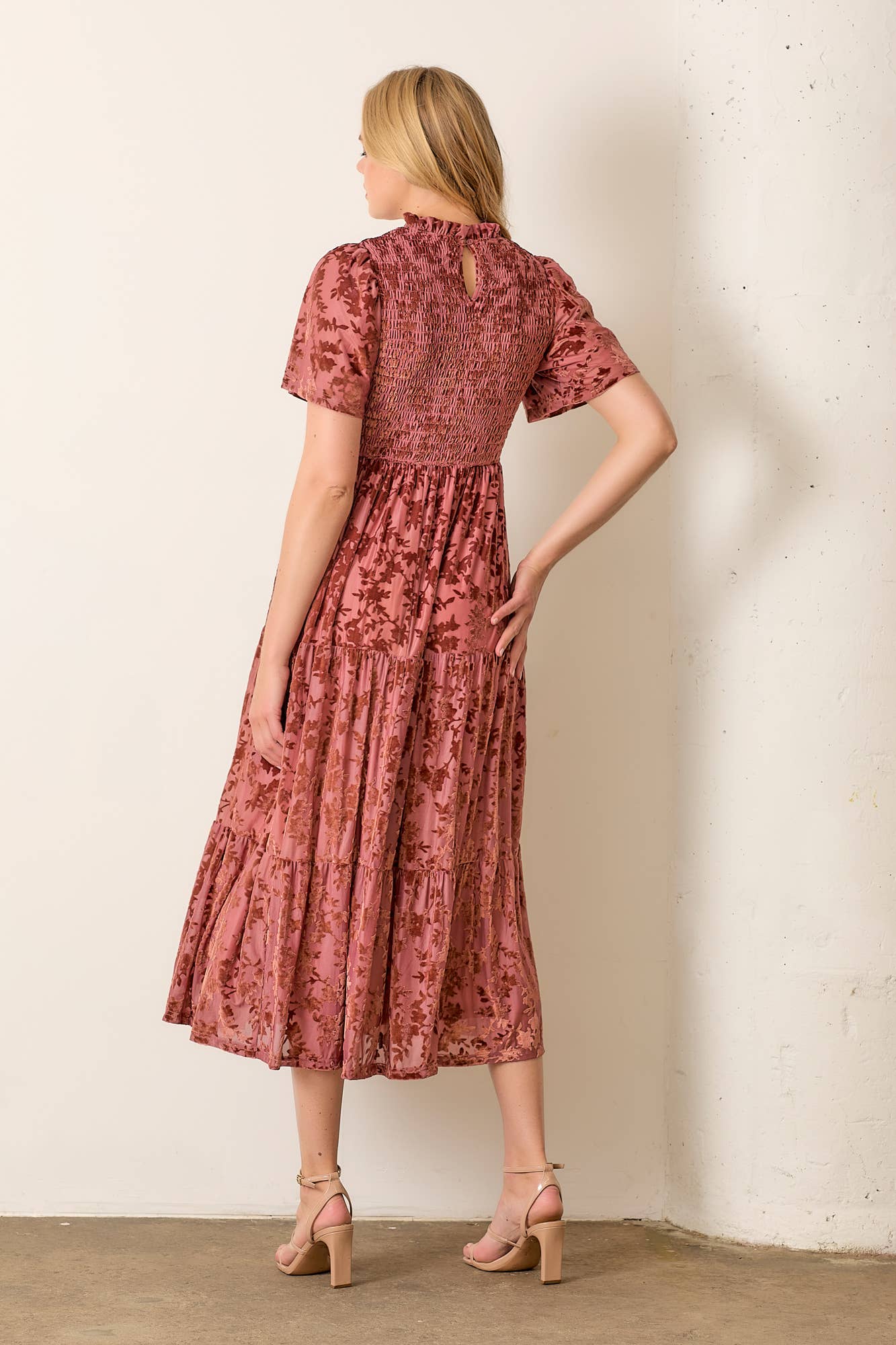 - Details: Short sleeves, flowing maxi length, soft drape
