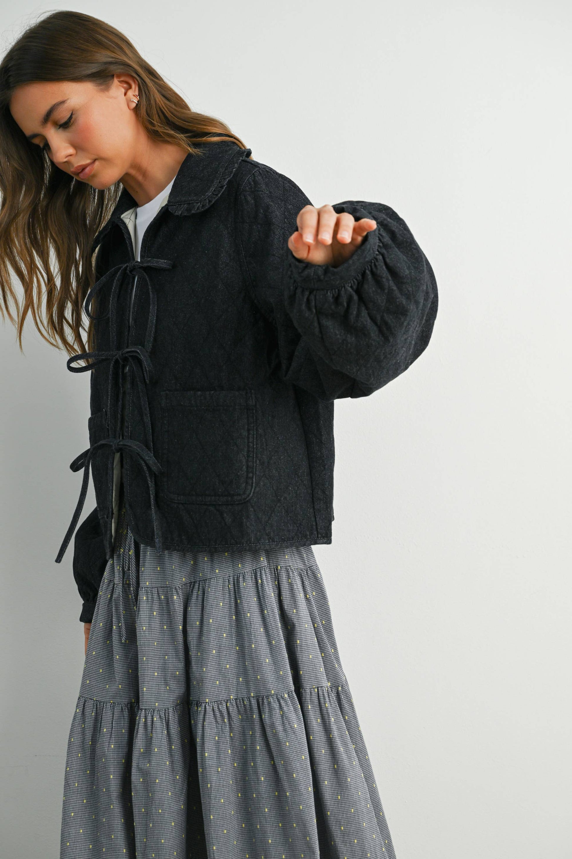 Stay warm and stylish with this quilted long sleeve tie-front jacket. Designed with a cozy quilted texture and a flattering tie-front closure, it offers both comfort and a touch of elegance. Perfect for layering on chilly days, this jacket pairs effortlessly with both casual and dressed-up looks.