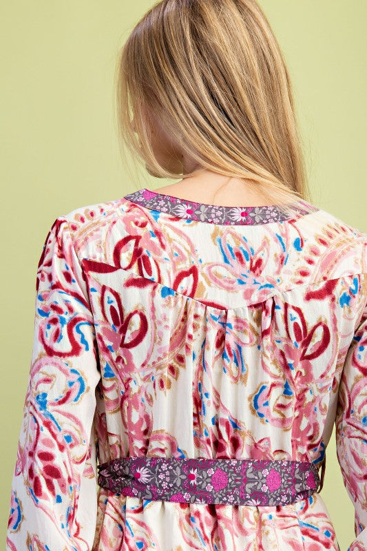 A dreamy watercolor print flows effortlessly through this tiered dress, featuring a flattering half-button front, waist tie for definition, and contrasting print accents that add a touch of artisanal charm. The skirt is fully lined for comfort and ease of wear—perfect for brunches, strolls, and every moment in between.