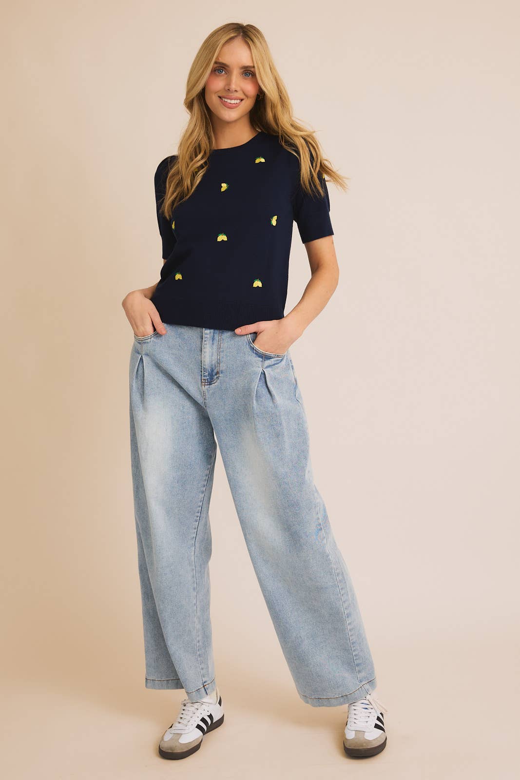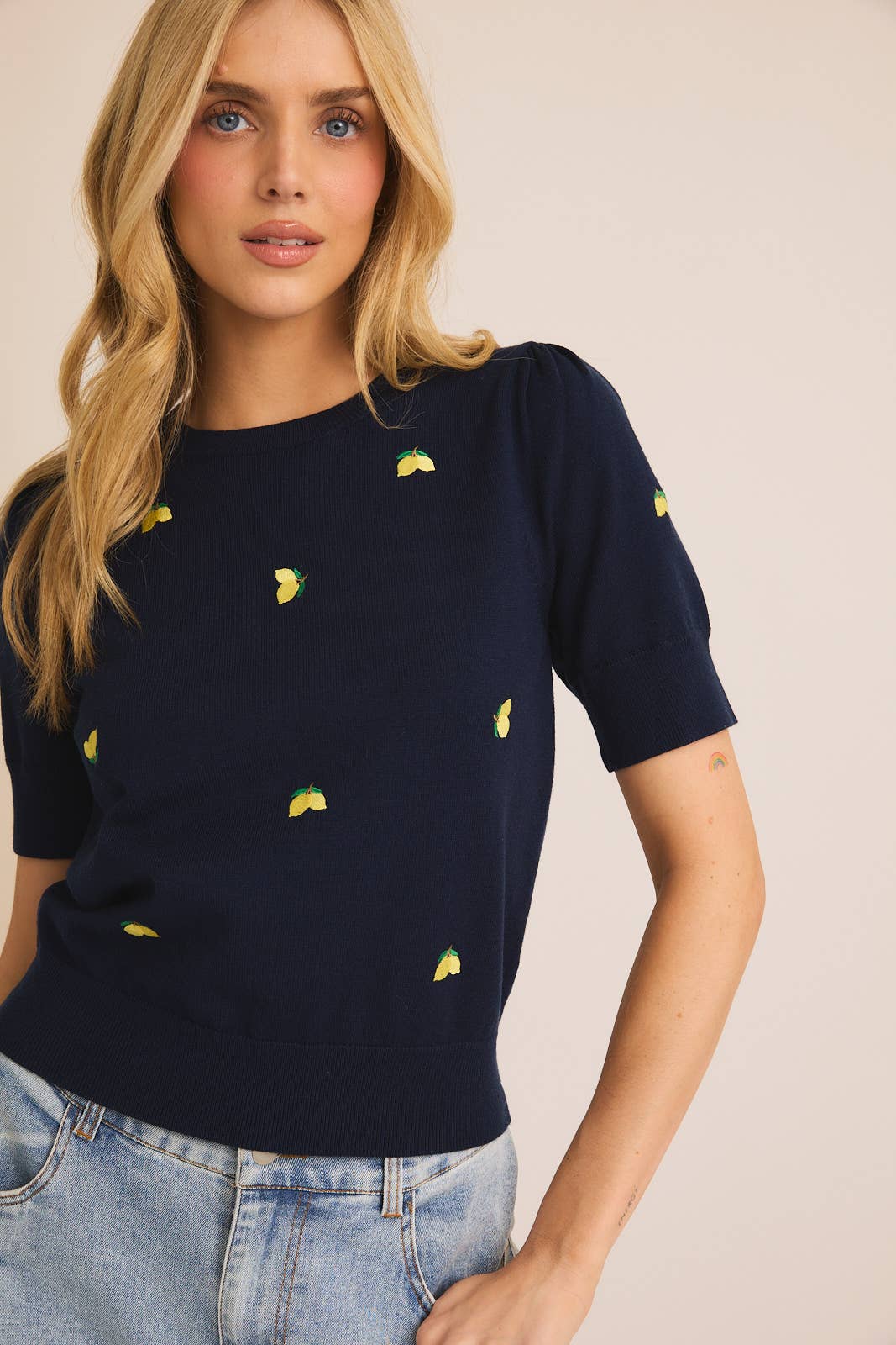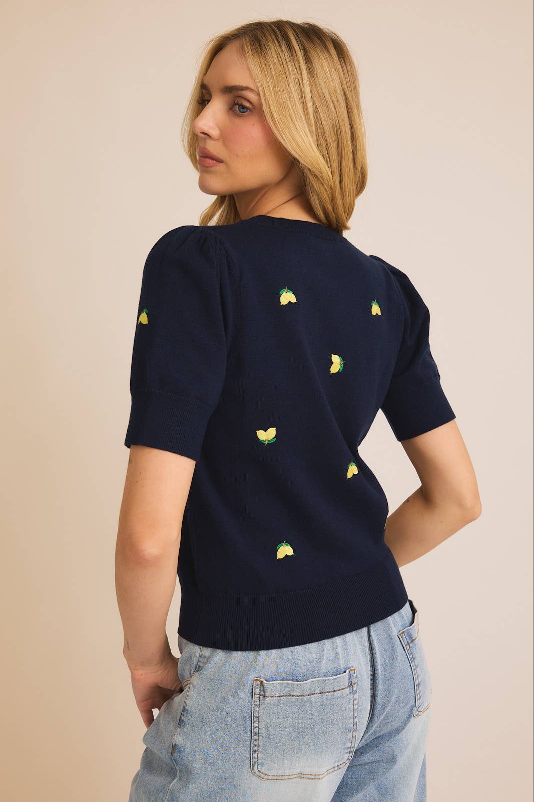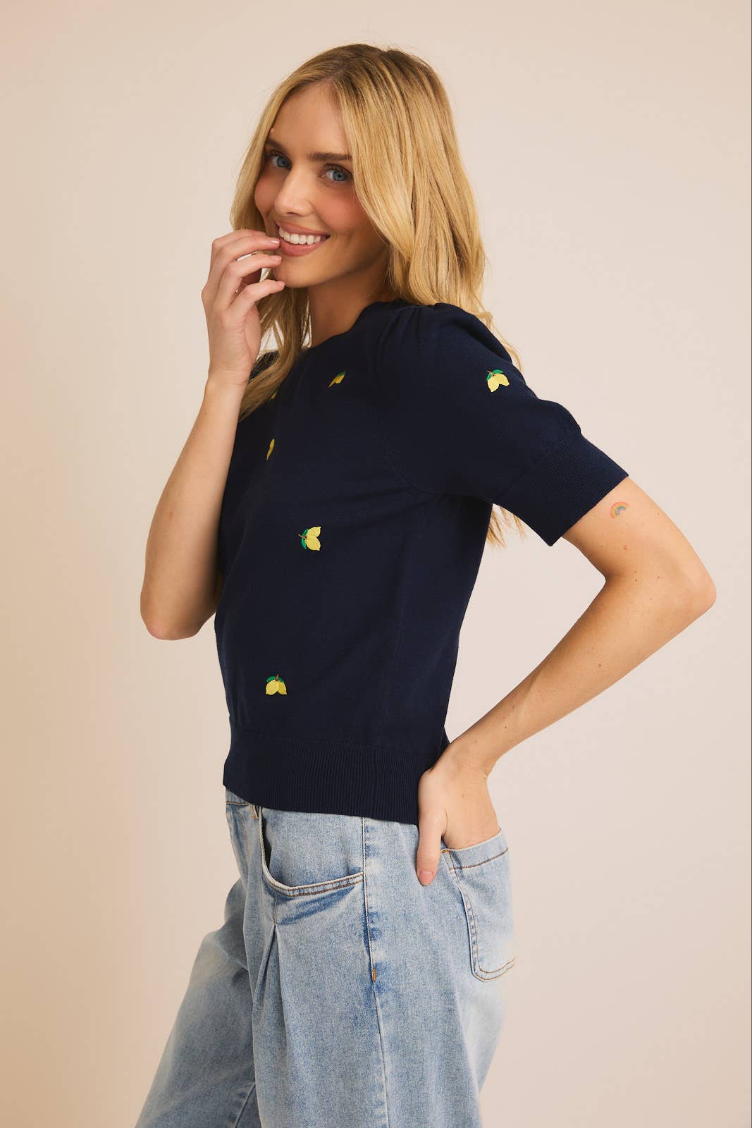 Round Neck Puff Sleeve Embroidered Lemon Knit Top