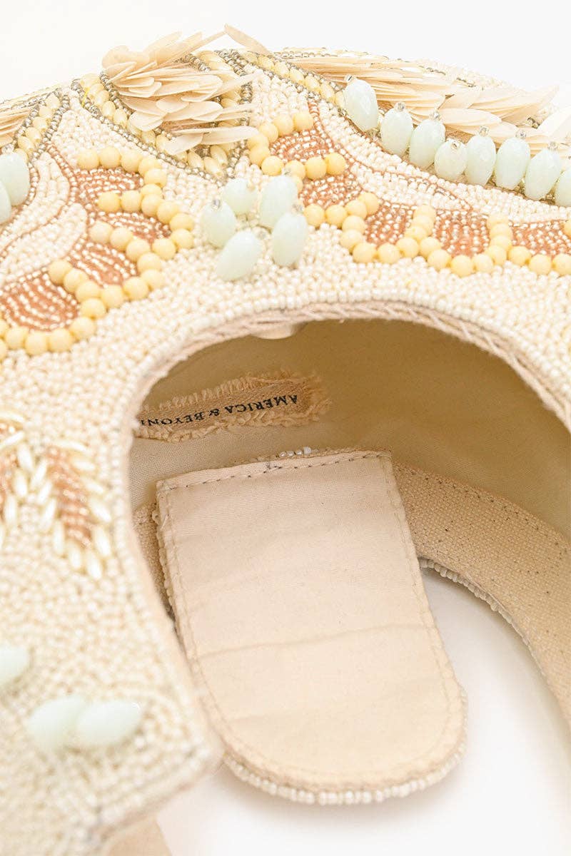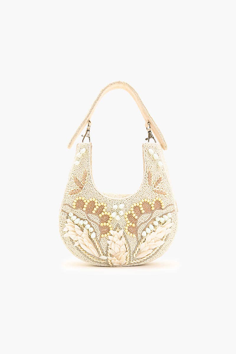 Shine bright and shimmer bold with the Shimmering Sands Mini Bag—a radiant little showstopper that’s made to dazzle. Hand-embellished with natural white pearls and delicate beads, this 100% cotton crossbody is elegance in a petite package. The detachable chain strap gives you the freedom to wear it as a shoulder bag or carry it by the beautifully beaded round handle for a luxe hand-held look. With a magnetic button closure and just the right size for your night-out essentials, this mini is your go-to for weddings, events, or anytime your outfit needs a touch of sparkle.