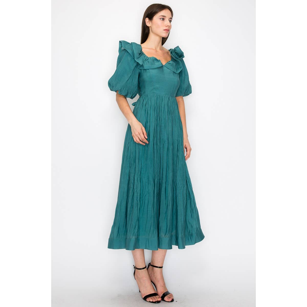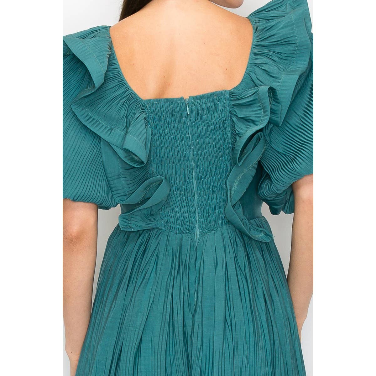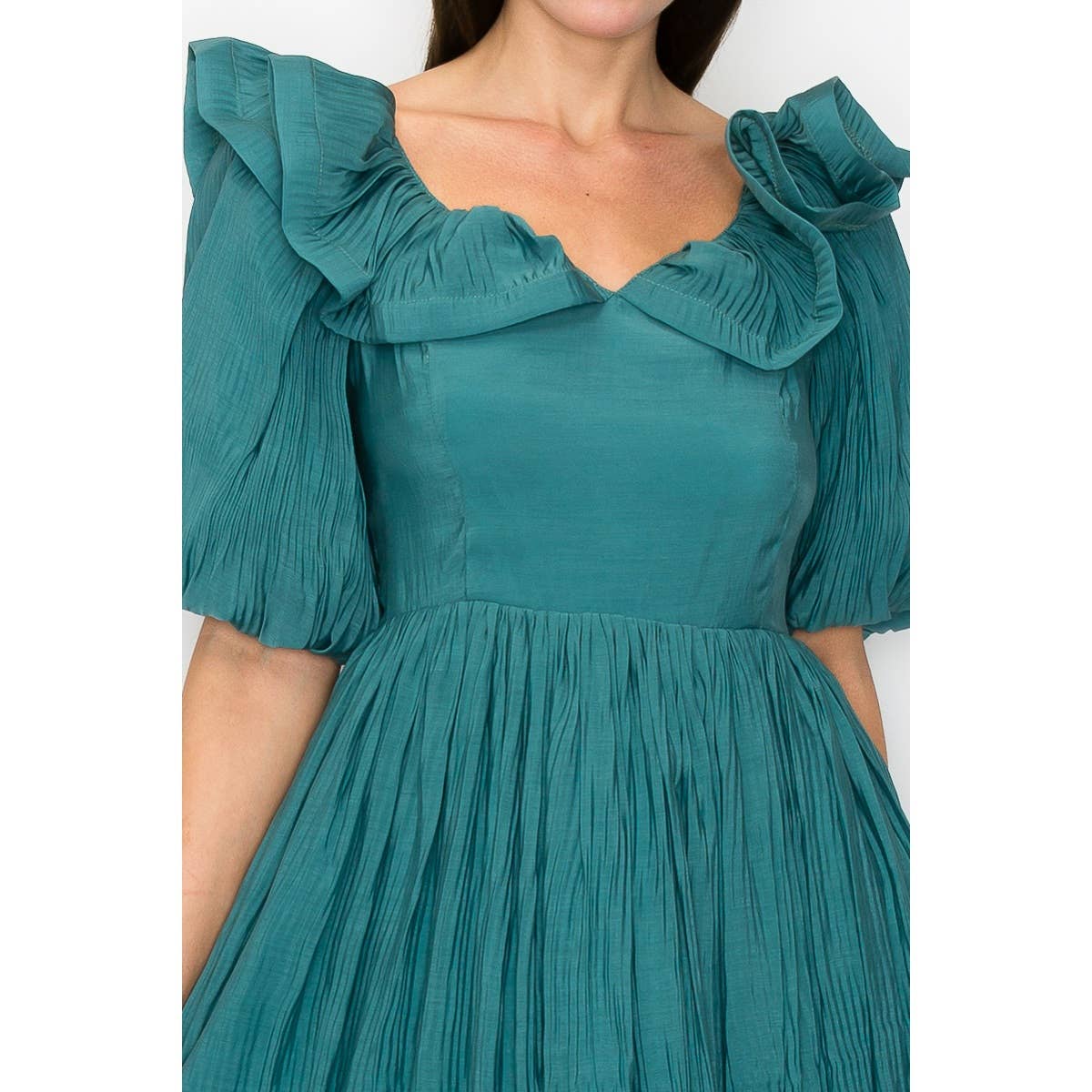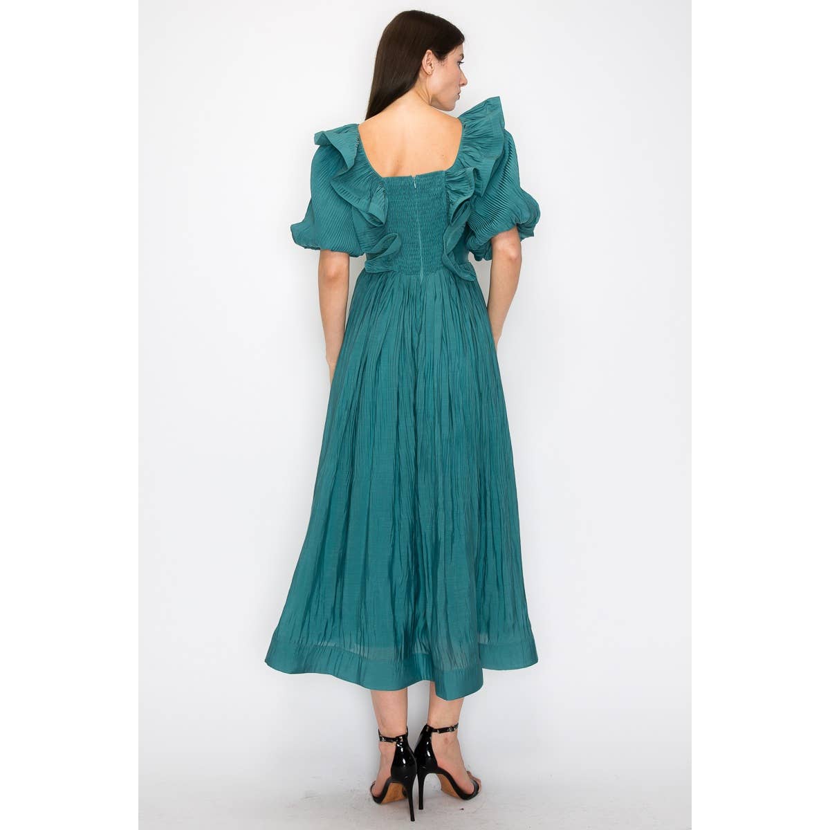 Short Puff Sleeve Pleated Ruffle Trim Midi Dress