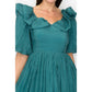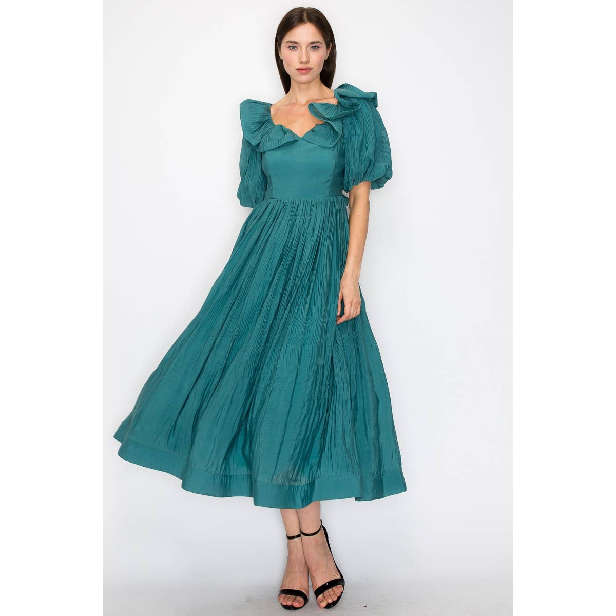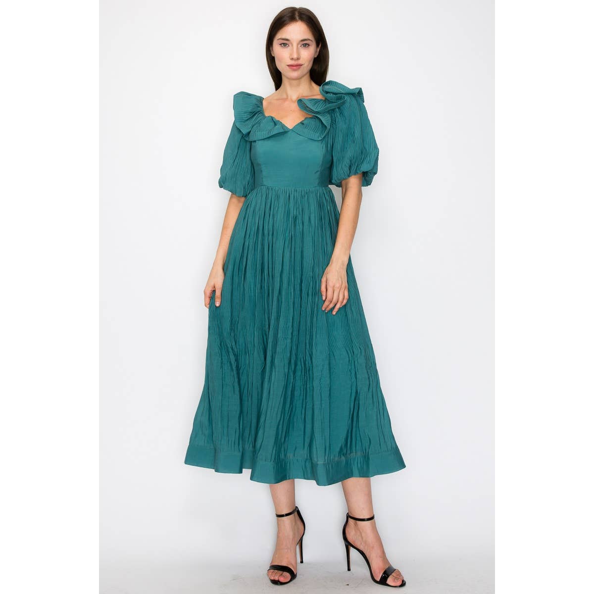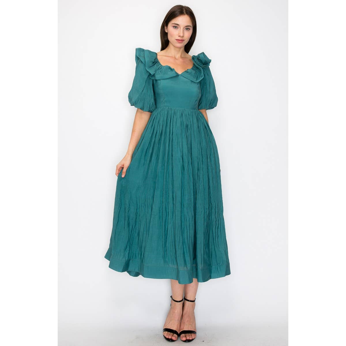 Short Puff Sleeve Pleated Ruffle Trim Midi Dress