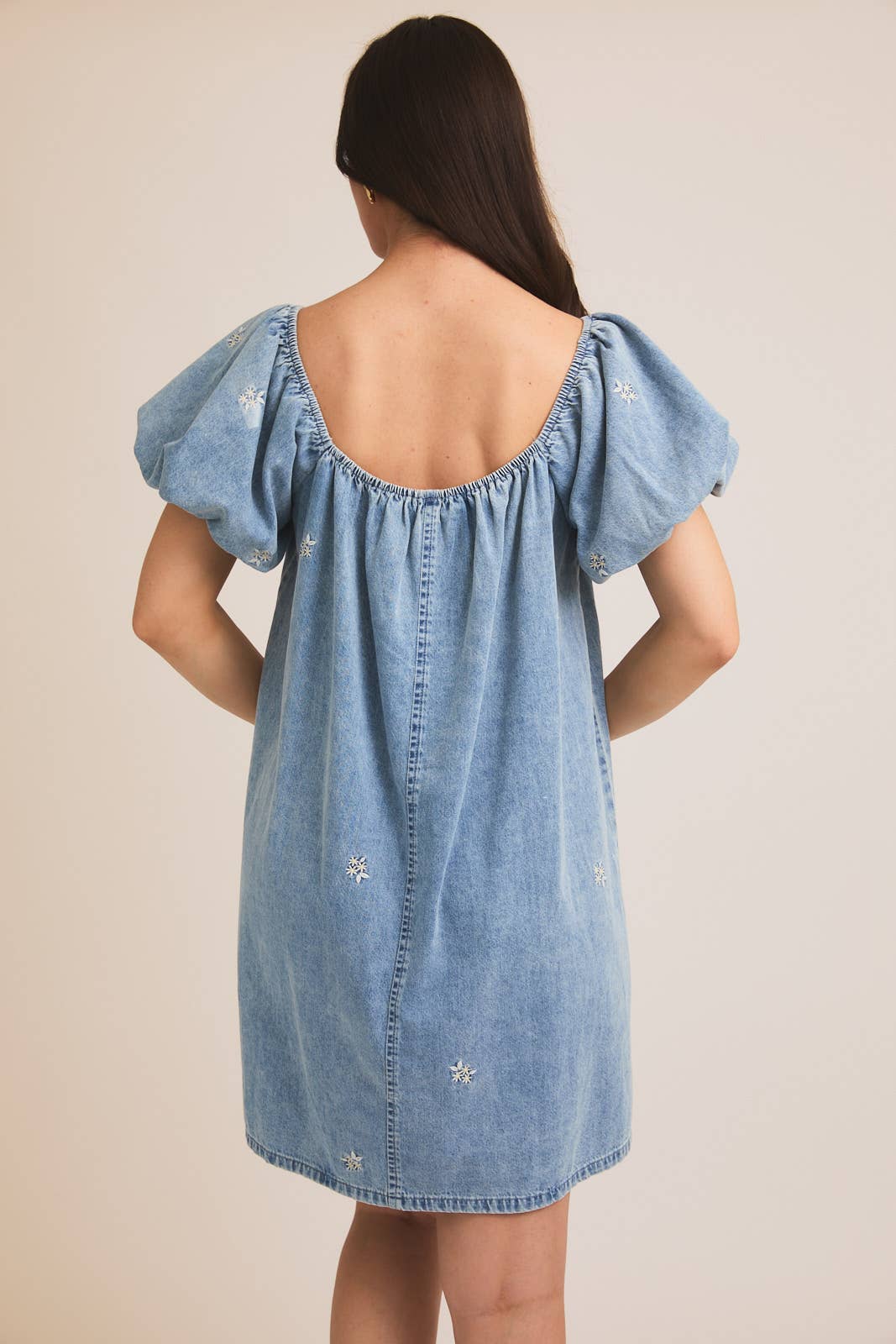 Vintage charm meets modern flair in the Bluebelle Bloom Dress. Made from light denim, this flattering square-neck mini features sweet puff sleeves and delicate floral embroidery that adds a soft, feminine contrast to its structured silhouette. Designed to highlight your shape while keeping things playful and chic, it’s the perfect day dress for weekend outings, brunches, or casual get-togethers.