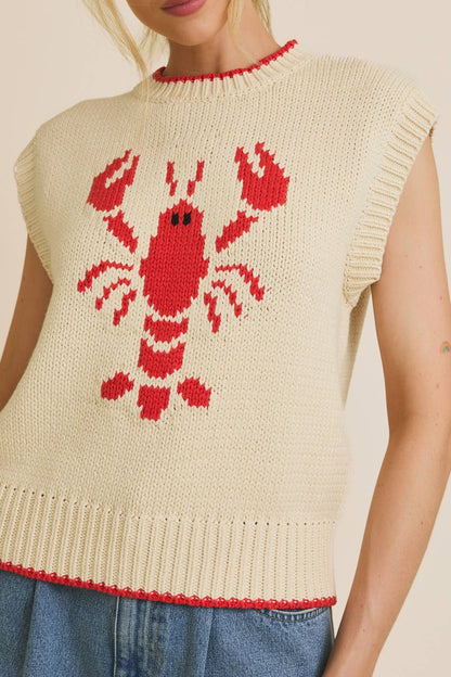 The Marina Lobster Knit Sweater is a playful yet chic sleeveless piece featuring a wide high neckline and a bold red lobster motif on a cream background. Crafted from soft knit fabric, this statement sweater is perfect for layering or wearing on its own for a fun, coastal-inspired look.