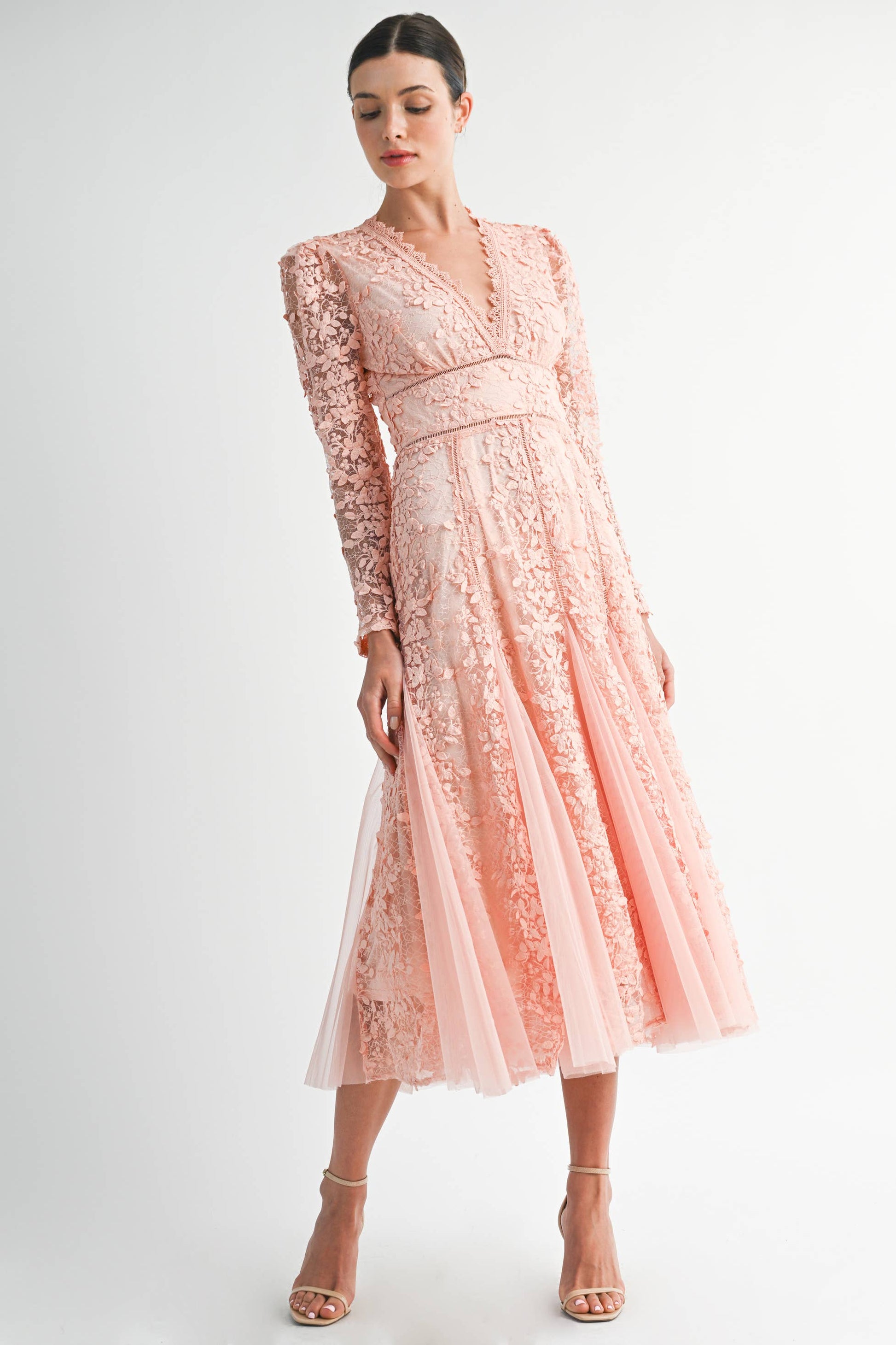 The full-sleeved, V-neck A-line dress is made from beautiful apricot colored lace with floral embroidery. It features a fitted bodice with a defined waistline, while the skirt includes sheer fabric panels that add volume and movement. This floor-length design features a vibrant embellishment, a graceful neckline, and a fluttering hem, making it perfect for special, formal occasions. Elegant and stylish, it's a timeless choice for any event!